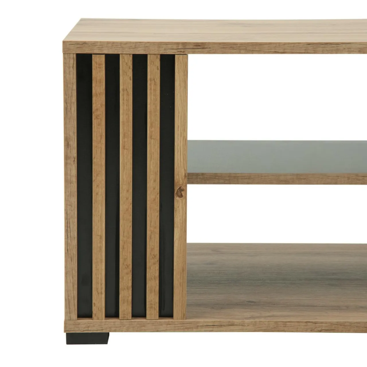 - Ciepły kolor dębu wotan, czarne, minimalistyczne elementy wykończenia i ozdobne lamele – całość prezentuje się elegancko i sprawi, że Twój salon wypełni współczesny design.