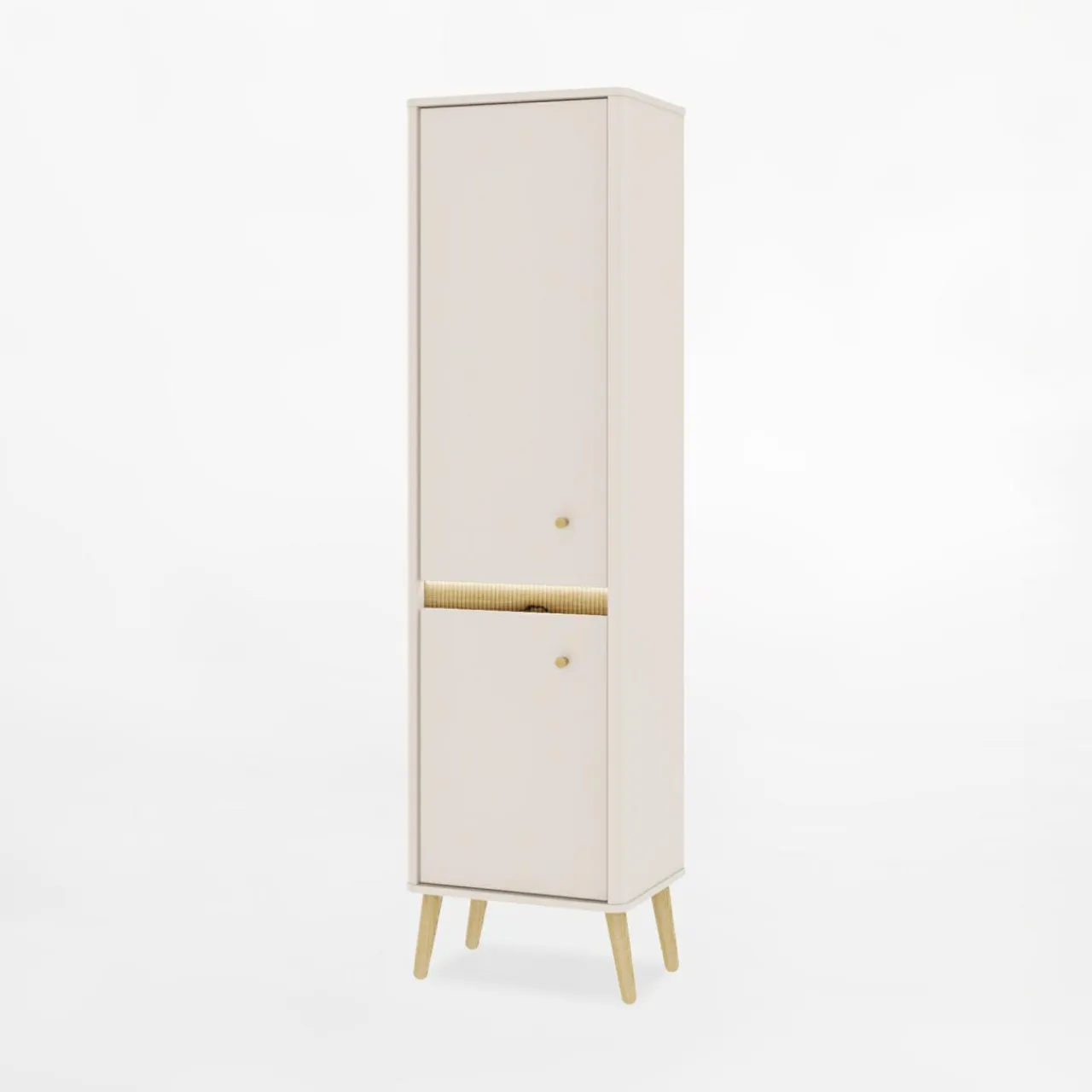 Szafa z kolekcji Lorena to mebel o subtelnej i eleganckiej stylistyce. Wykonana w nowoczesnym stylu, łączy w sobie estetykę oraz praktyczne rozwiązania, które świetnie sprawdzą się zarówno w salonie, przedpokoju, jak i sypialni. Delikatny odcień kaszmiru w połączeniu z nóżkami w kolorze dębu nadaje szafie lekkości i wprowadza do wnętrza przytulny klimat.