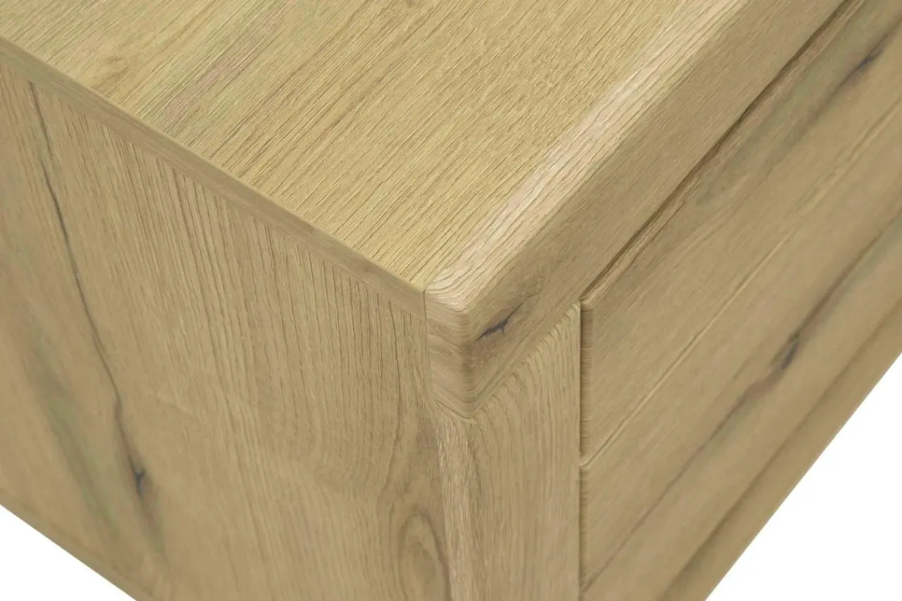 - Szafka jest wykończona laminatem oraz folią, imitującymi naturalny dąb w odcieniu Coast Evoke.