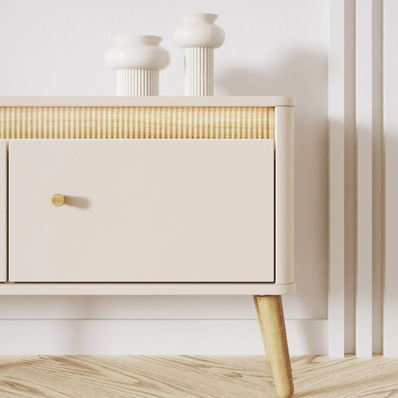 Meble w subtelnym odcieniu kaszmiru połączono z nóżkami w kolorze naturalnego dębu, co wprowadza do wnętrza ciepły i przytulny styl. Doskonale komponuje się zarówno z minimalistycznymi, jak i skandynawskimi aranżacjami, dodając im charakteru.