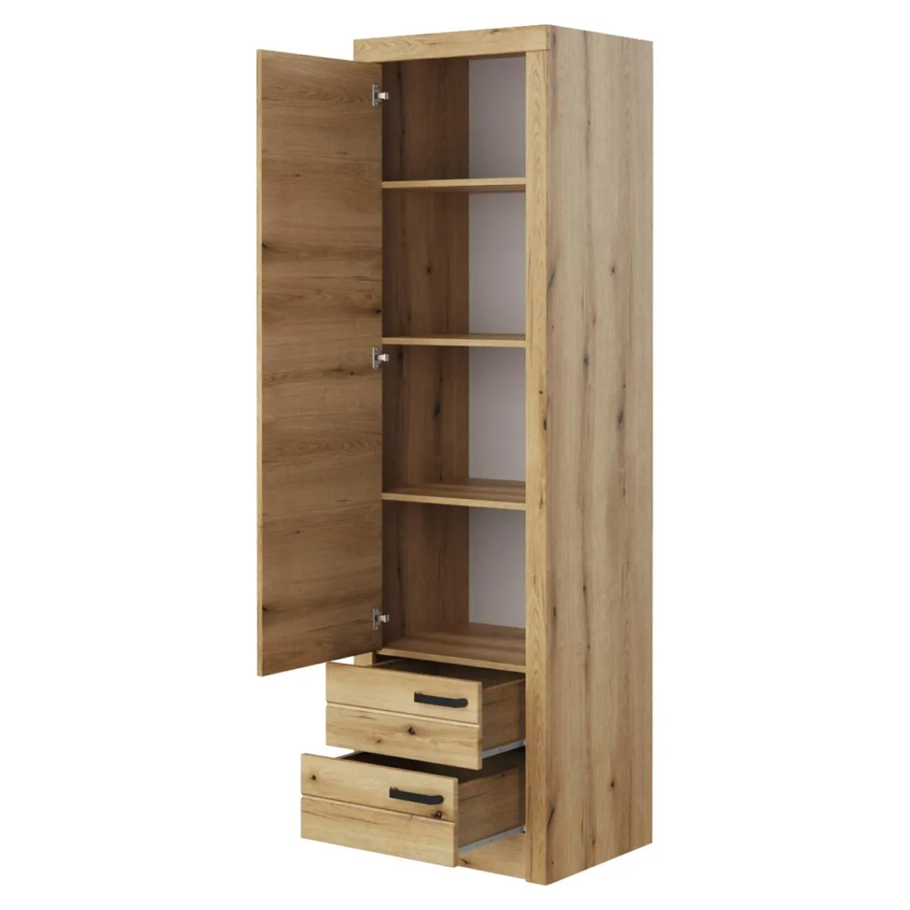 - Duży front umieszczony na 3 zawiasach pozwoli na swobodne otwarcie szafy, odkrywając jej stylową zawartość.