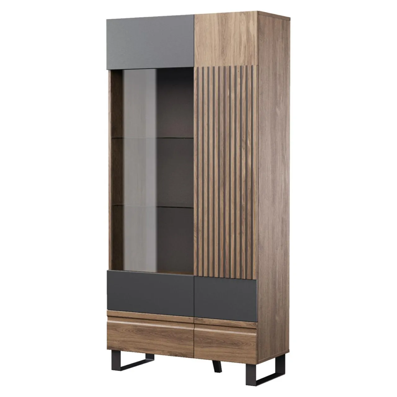Dzięki zastosowaniu efektu lameli na froncie, witryna BOSTON 2D podkreśla nietuzinkowy wystrój jadalni lub pokoju dziennego. Szerokość witryny (92 cm) sprawia, że łatwo dopasujesz ją nawet do niewielkiego pomieszczenia.