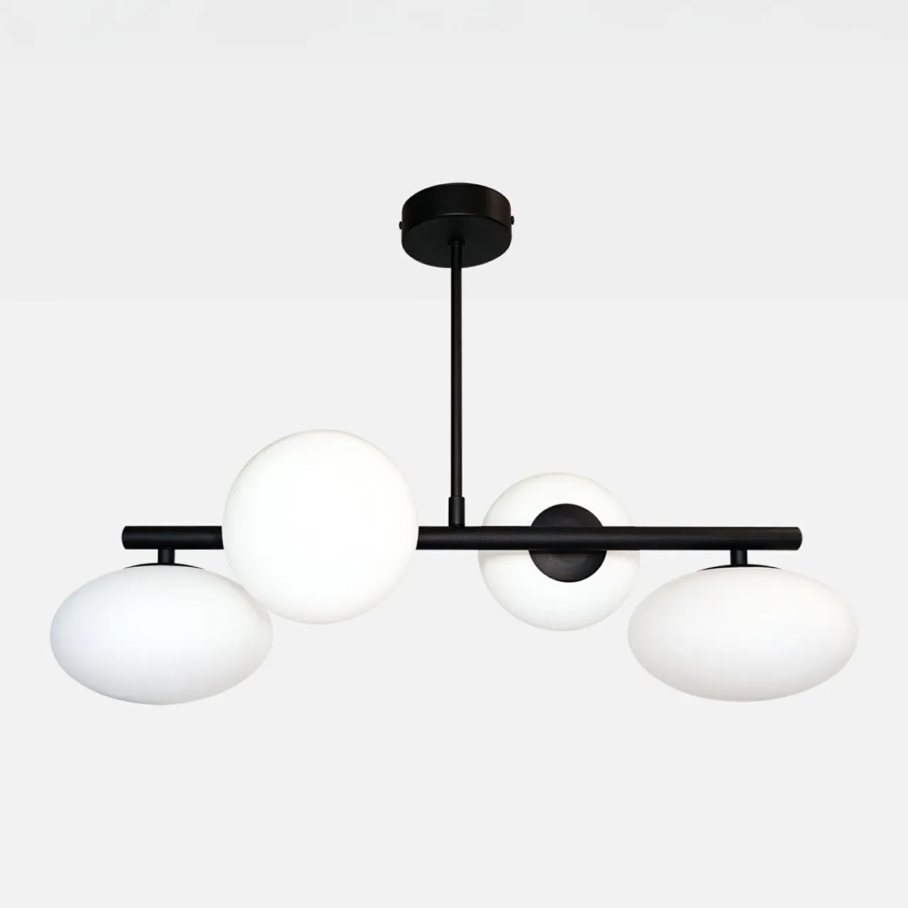 Posiada ona 4 rozłożyste ramiona zakończone mlecznobiałymi owalnymi kloszami.