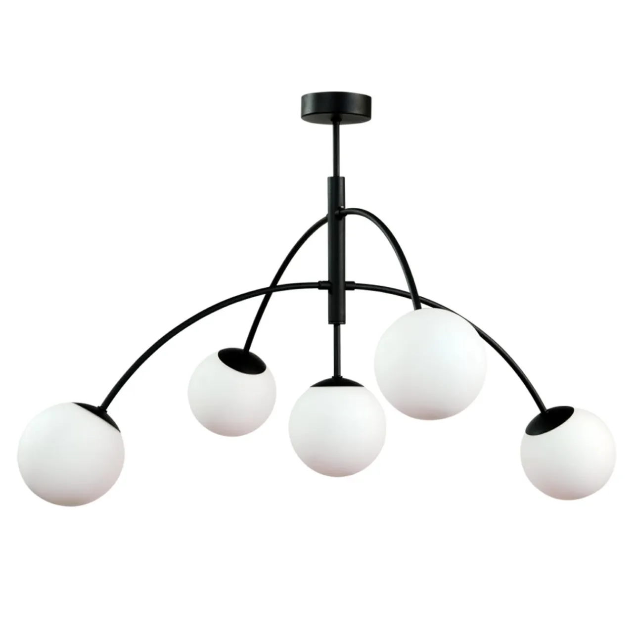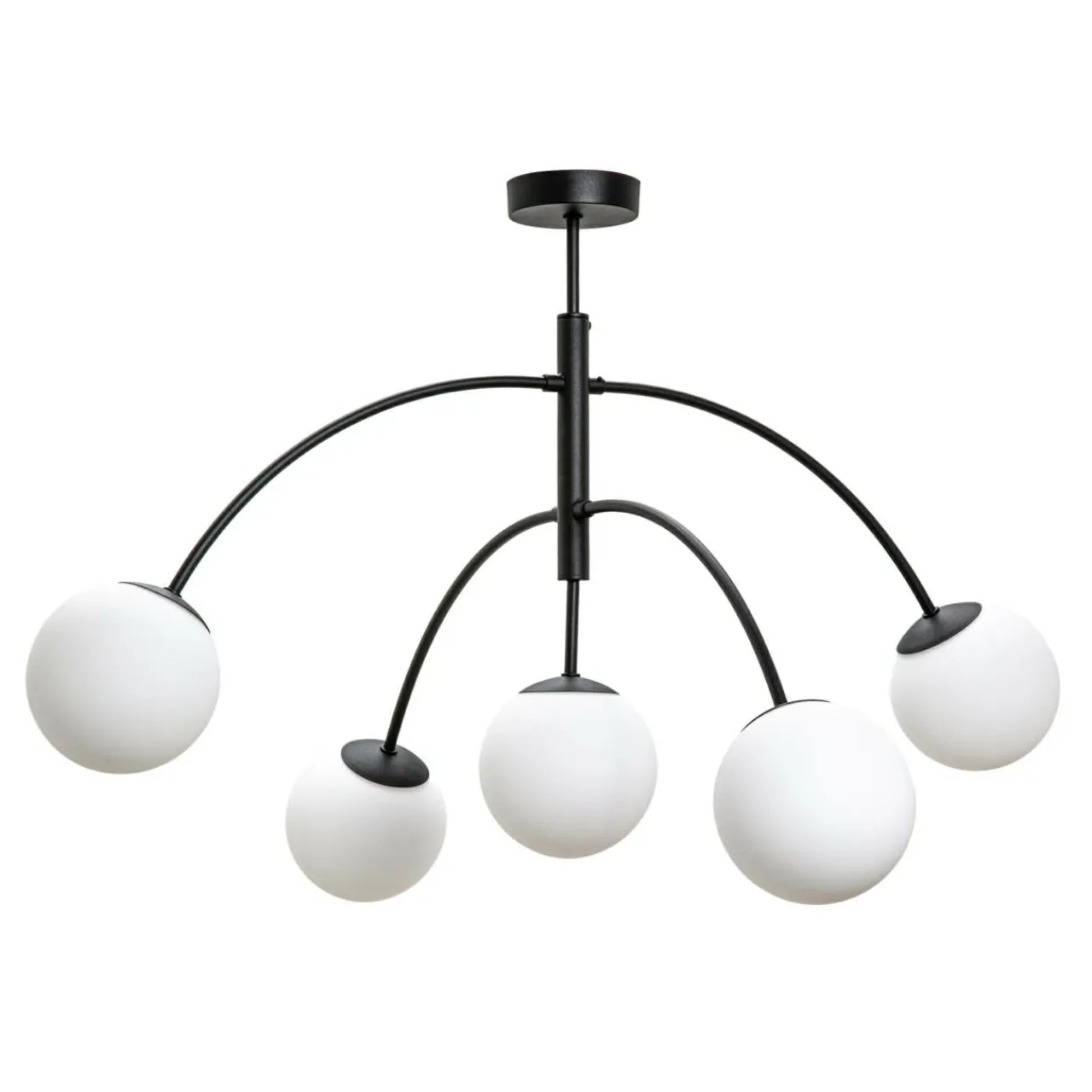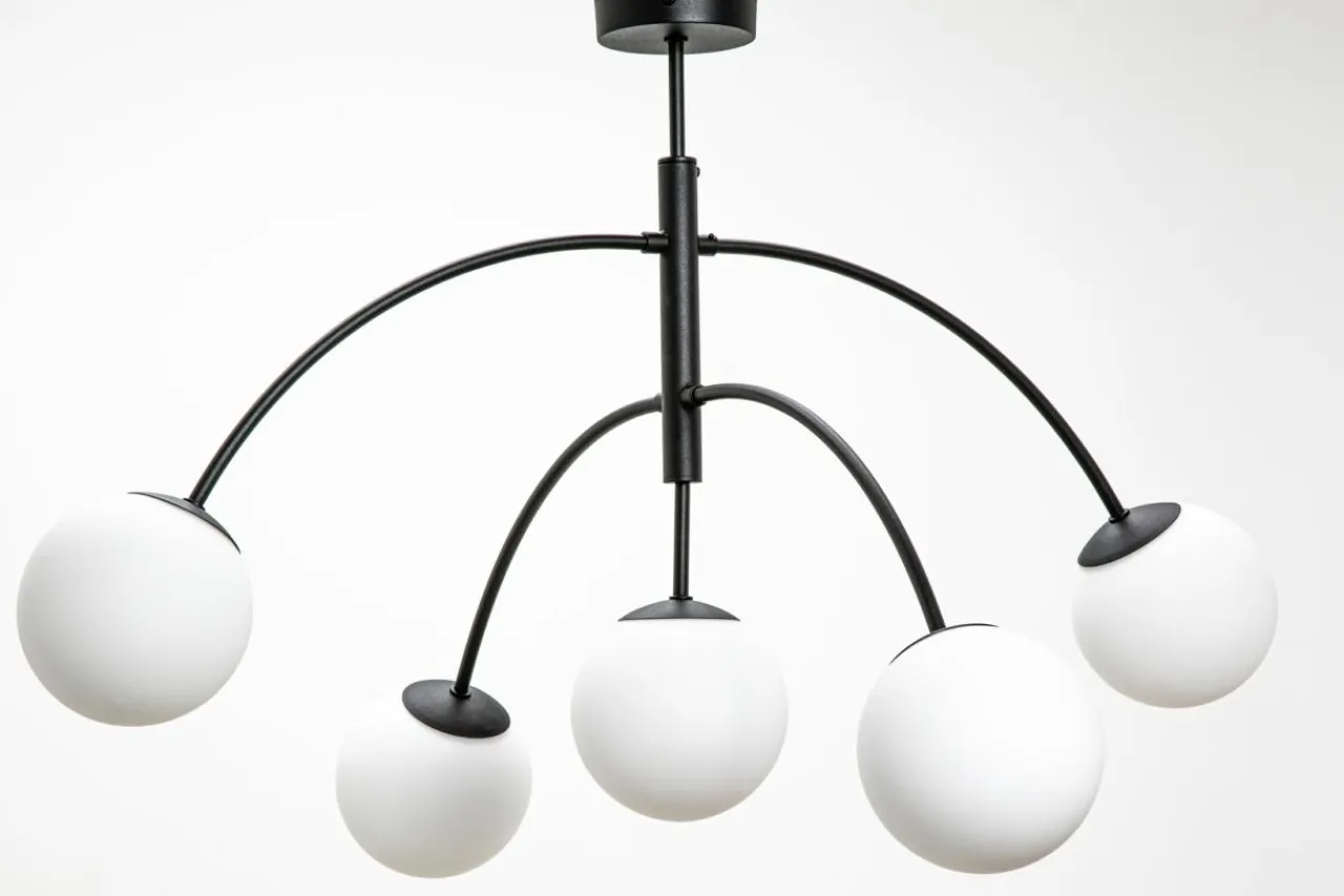 Od okrągłej podsufitki biegną ramiona, które układają się nachodzące na siebie łuki, zwieńczone kulistymi kloszami. Tworzą razem kompozycję, która pasuje do eleganckiego, gustownie urządzonego wnętrza.