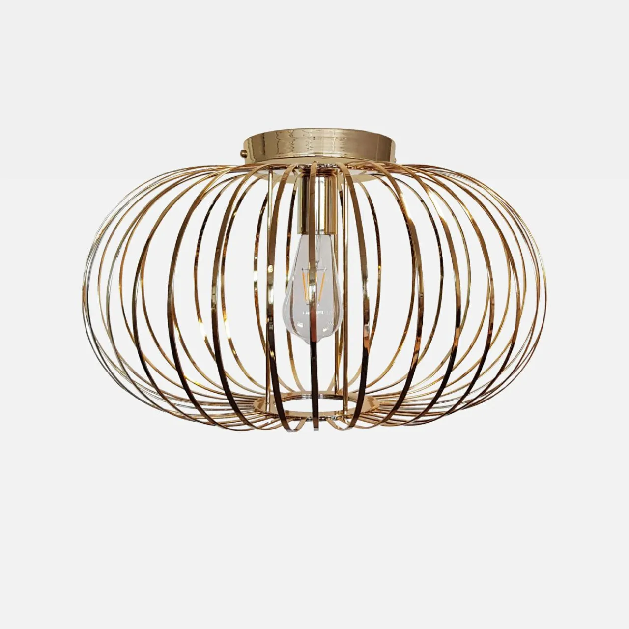 Zachwyca ona żebrowanym kloszem w błyszczącym, złotym odcieniu o średnicy 50 cm, który wręcz domaga się odpowiedniej ekspozycji w pokoju dziennym lub jadalni.