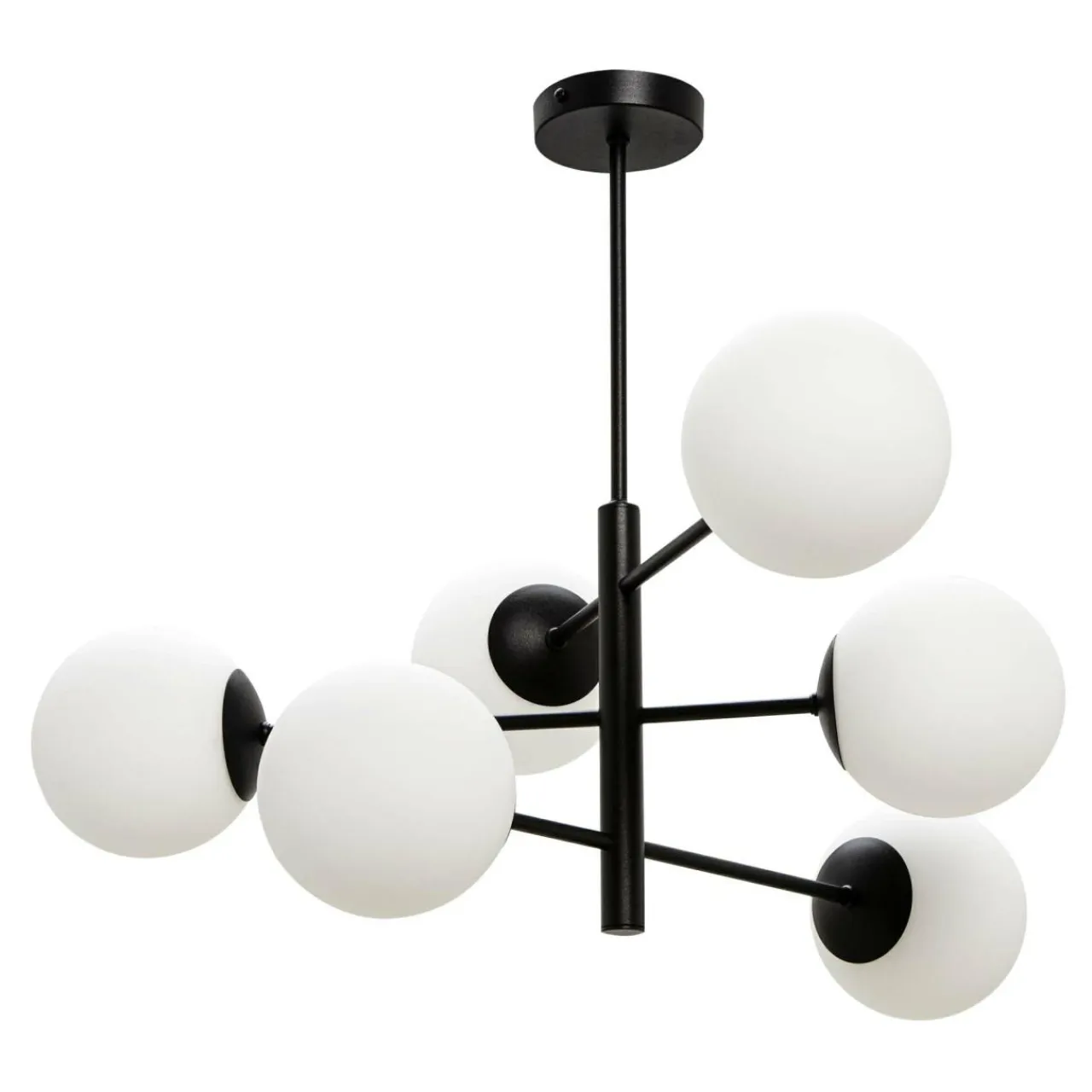 Klosze, które wieńczą lampę są połączone w przejrzysty sposób za pomocą prostopadle połączonych ramion. Mlecznobiałe kule całkowicie osłaniają żarówki, a wykończenie bazy w czarnym kolorze nadaje całości minimalistycznego posmaku i doskonale koresponduje z meblami w odcieniach szarości, czerni i bieli.