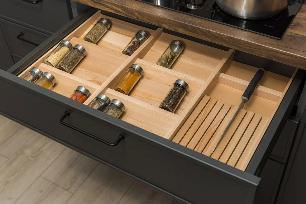 Użyj wkładu na noże lub innych modeli z kolekcji Q-WOOD, by zapełnić wnętrze szuflady w Twojej kuchni.
