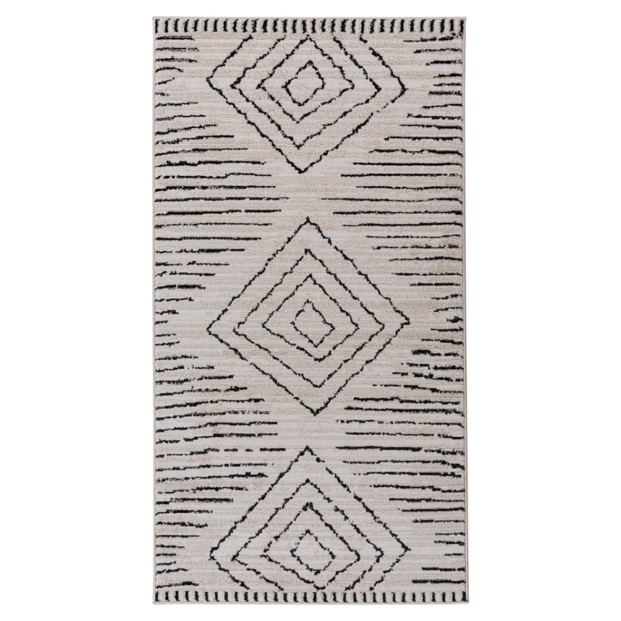 Dywan BOHO z motywem linii i rombów idealnie komponuje się z dodatkami z motywem zaklinacza snu, dekoracjami z wełny i lnu.
