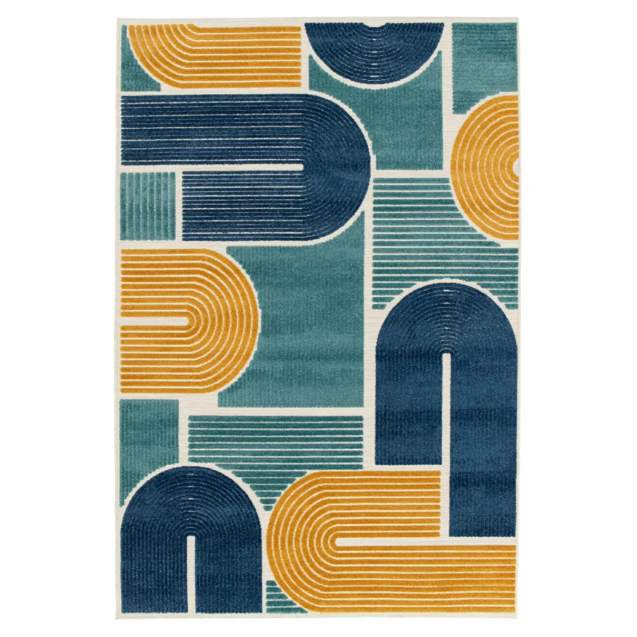 Twój salon zyska zupełnie nowy wygląd, dzięki geometrycznemu dywanowi JAMAJKA . Żółty kolor doda mu energii i ożywi przestrzeń. Niebieskie półkola, kwadraty i pasy obudzą pozytywne myśli.