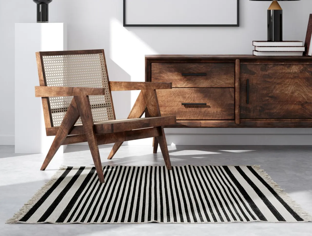 Biel i czerń oraz frędzle idealnie sprawdzą się we wnętrzach urządzonych w stylu minimalistycznym, ale i skandynawskim, retro oraz boho.