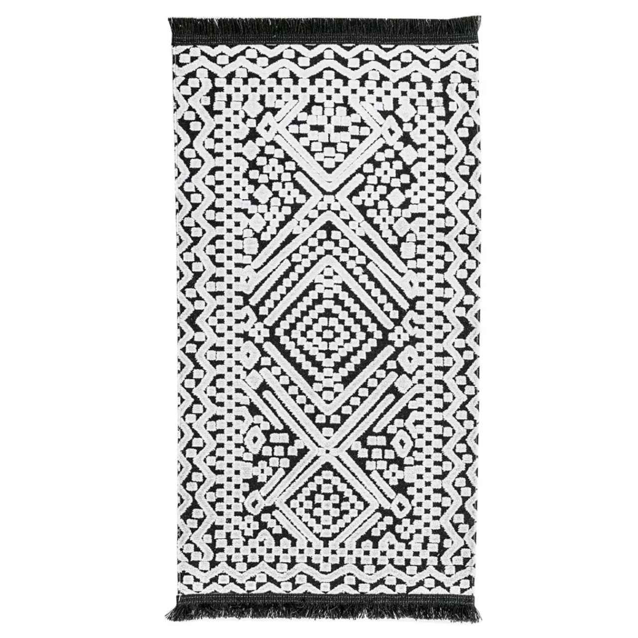 Dywanik wykończono taśmą z frędzlami, więc estetycznie wpasuje się we wnętrza w stylu boho i etno.