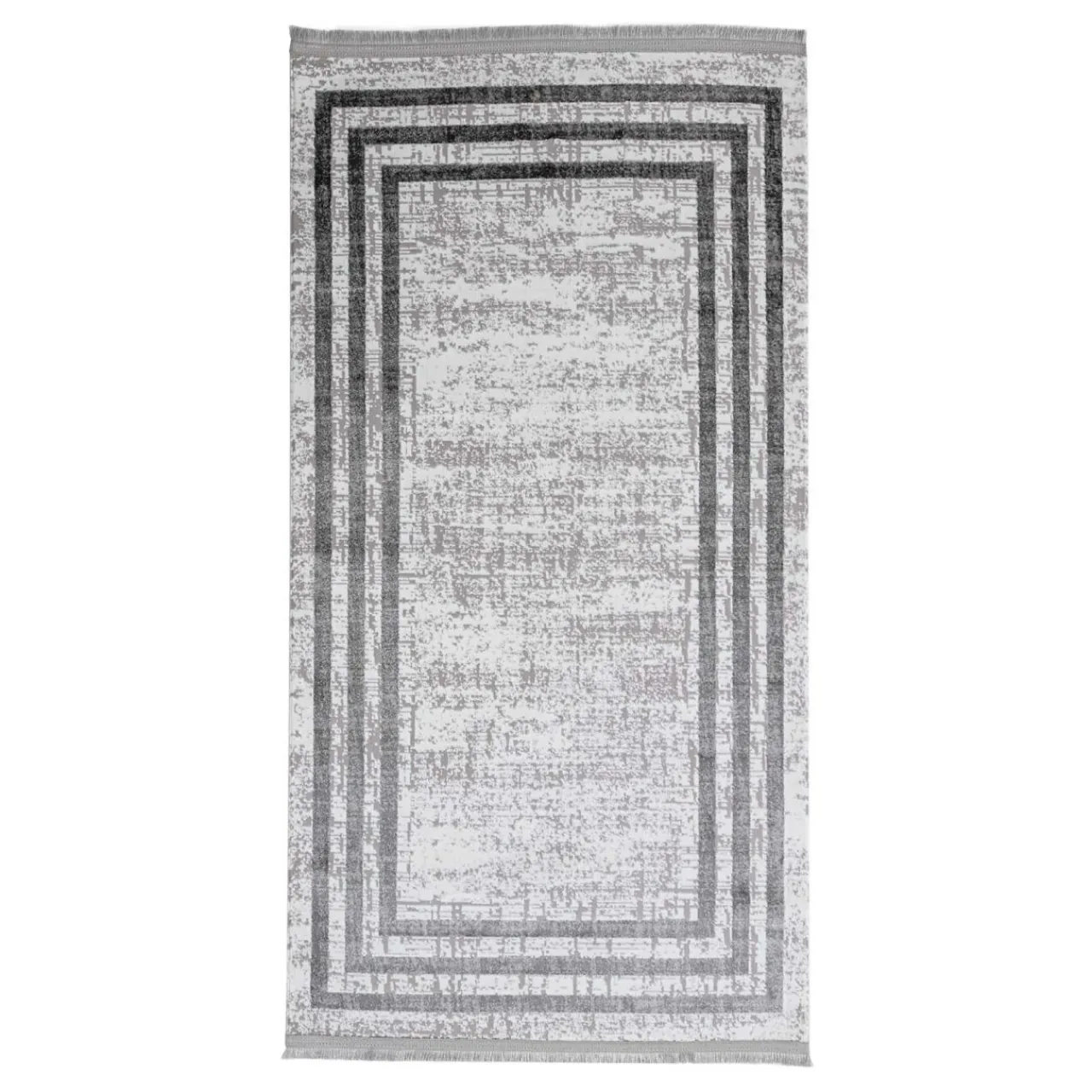 - Dywan ma jasnoszary kolor, a zdobią go antracytowe pasy.