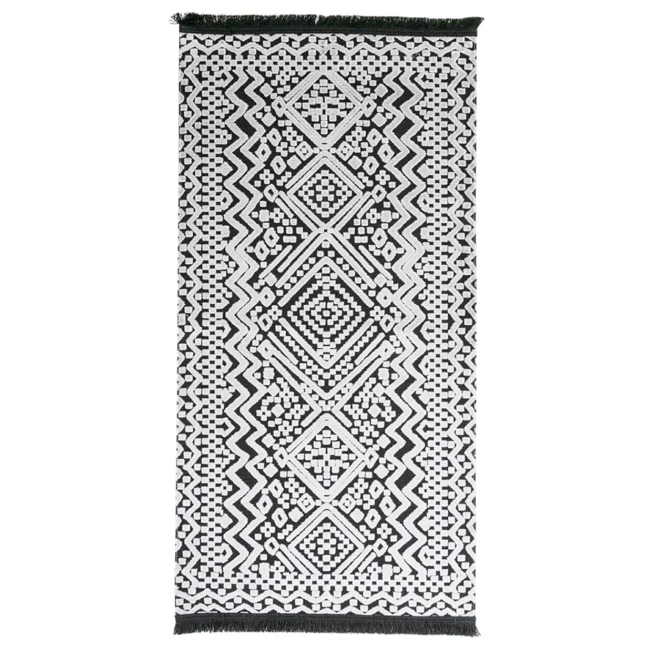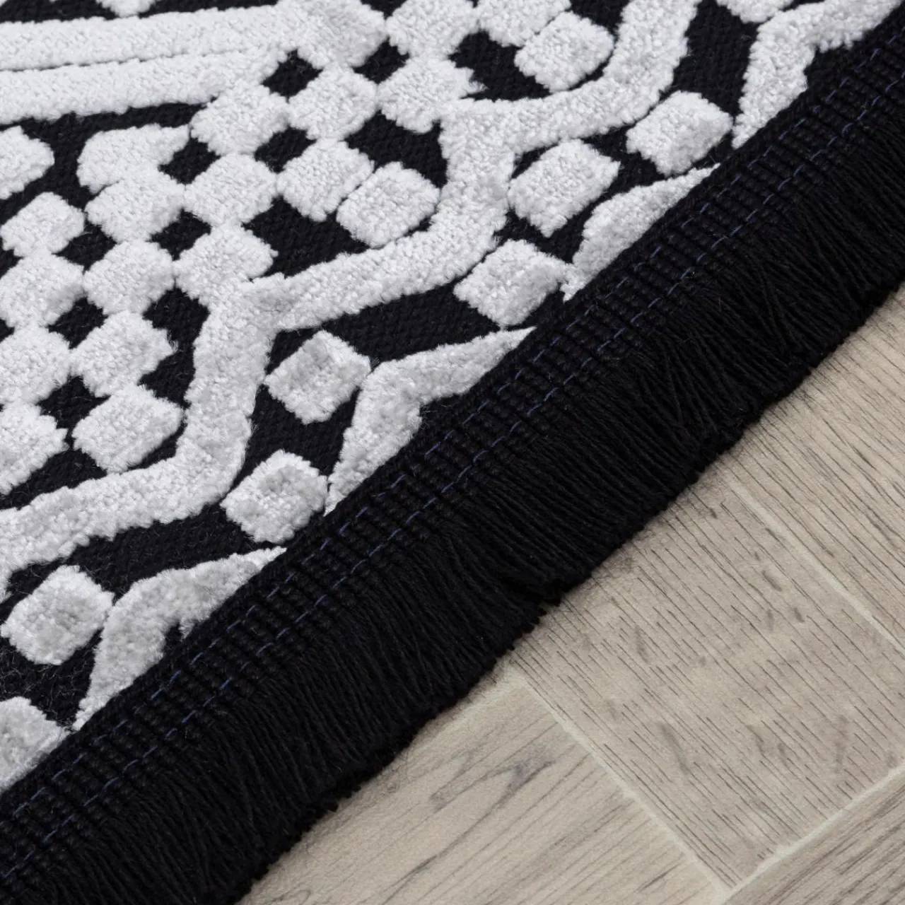 Dywan wykończono taśmą z frędzlami, więc estetycznie wpasuje się we wnętrza w stylu boho i etno.