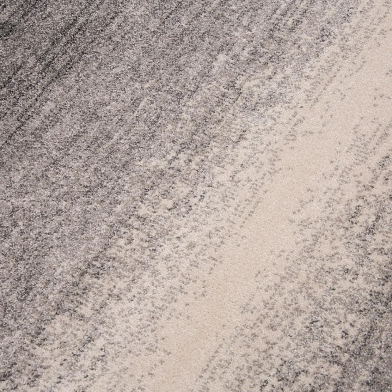 - Wzór dywanu jest abstrakcyjny. Przypomina nieco płótno malarskie, na którym malarz wykonał podmalówkę. Na górze i na dole rozlokowane są ciemniejsze odcienie szarości, na samym środku znajduje się beżowe pasmo. Ze względu na niejednolitą barwę, dywan sprawia wrażenie przecieranego i w związku z tym, pasować będzie również do wnętrz w stylu vintage.
