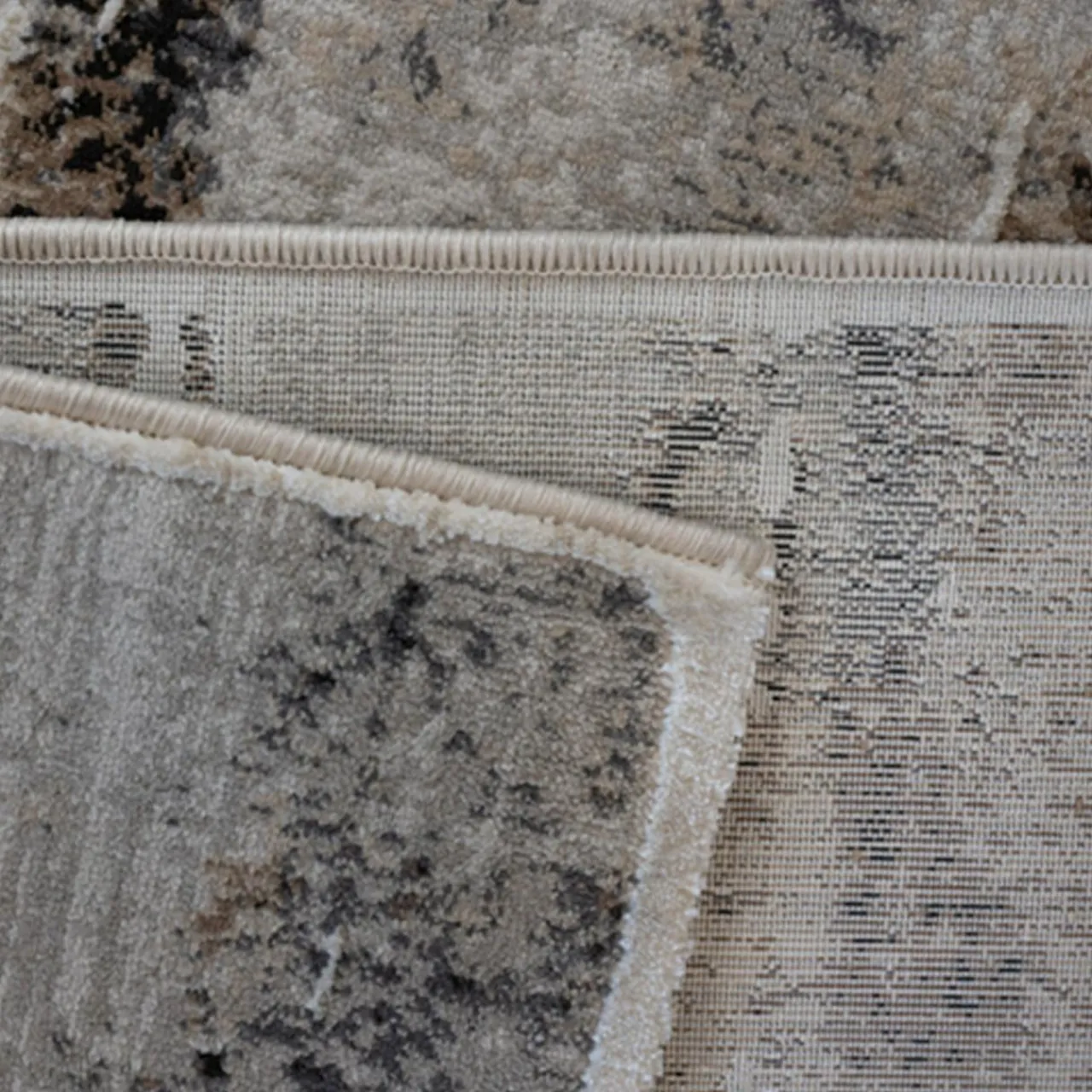 - Wzór dywanu jest abstrakcyjny. Kolorystyka utrzymana jest w odcieniach beżu. Gdzieniegdzie widoczne są plamy ciemniejszych kolorów: szarości i brązów. Ze względu na niejednolitą barwę, dywan sprawia wrażenie przecieranego i w związku z tym, pasować będzie również do wnętrz w stylu vintage.