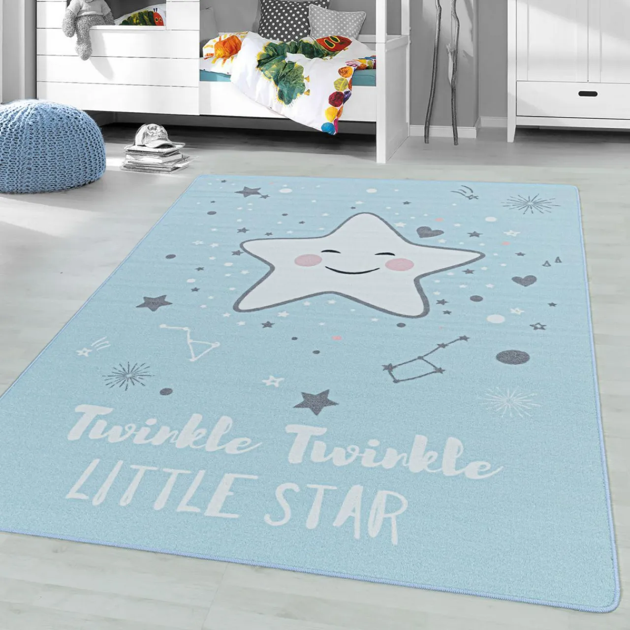 Twoje dziecko marzy o tym, aby przenieść się do bajkowego świata? Teraz to możliwe. Zdecyduj się na zakup niebieskiego dywanu PLAY z motywem uśmiechniętej gwiazdki. Uroczy napis „Twinkle twinkle little star” odwołuje się do słów kołysanki, która w polskiej wersji językowej brzmi: „Mrugaj, mrugaj gwiazdko ma…„
