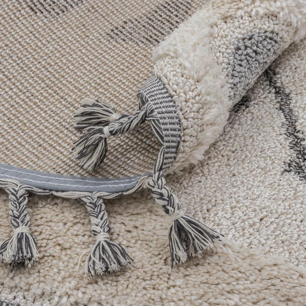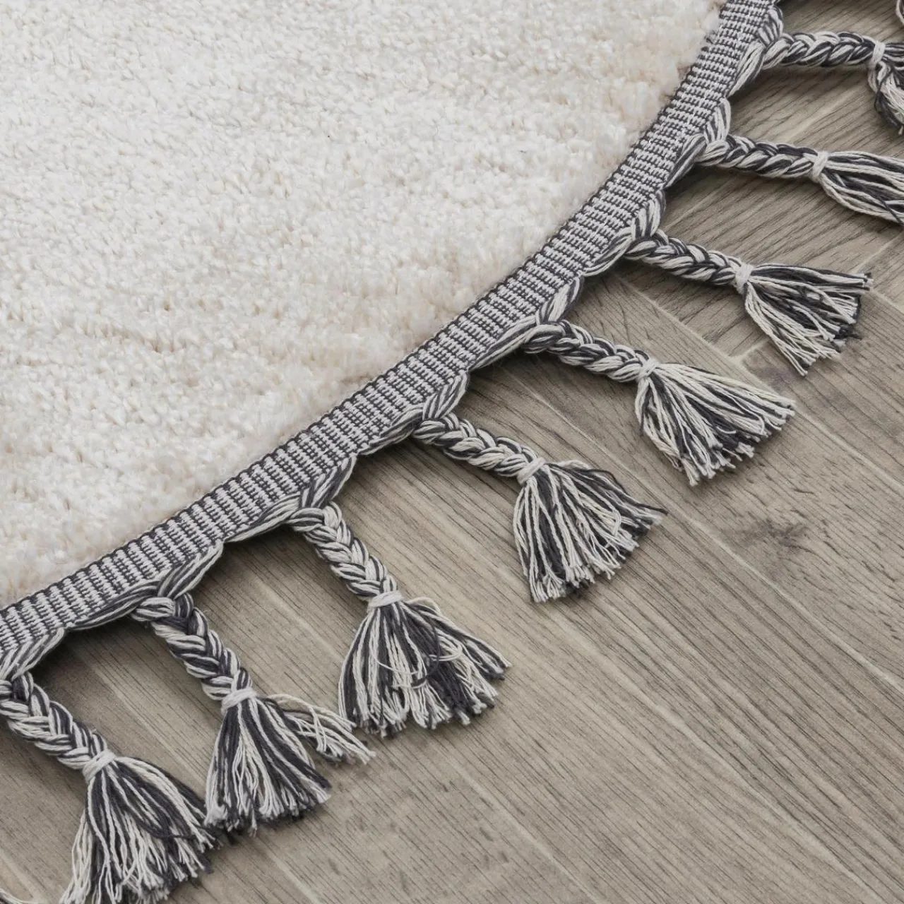 Okrągły dywan w kremowym kolorze z ozdobnymi frędzlami pasuje do jasnych mebli i ścian w naturalnych barwach.