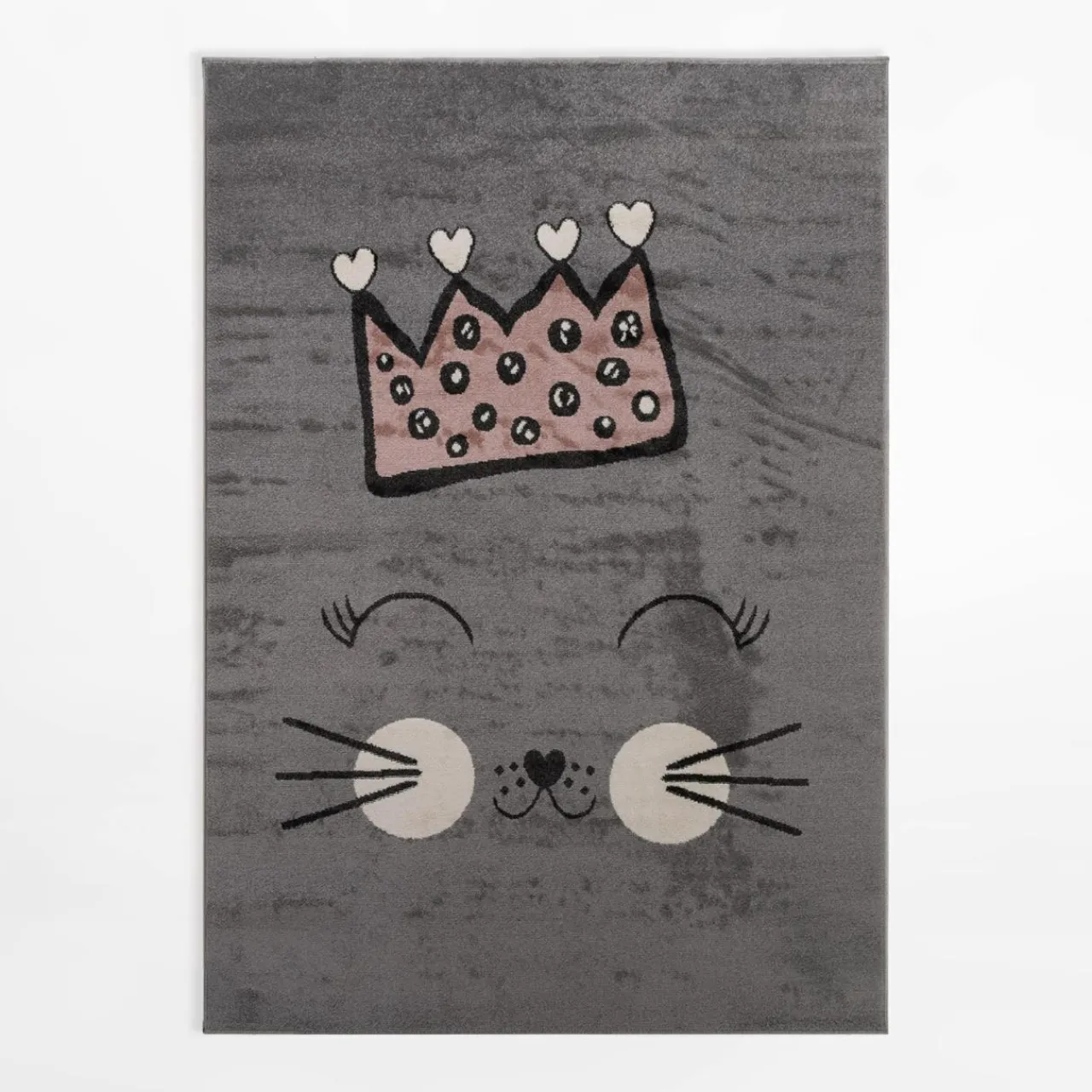 - Kotek w królewskim wydaniu: dywan ma szary kolor, który dobrze komponuje się z różową koroną.