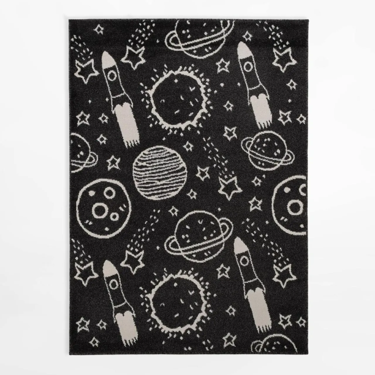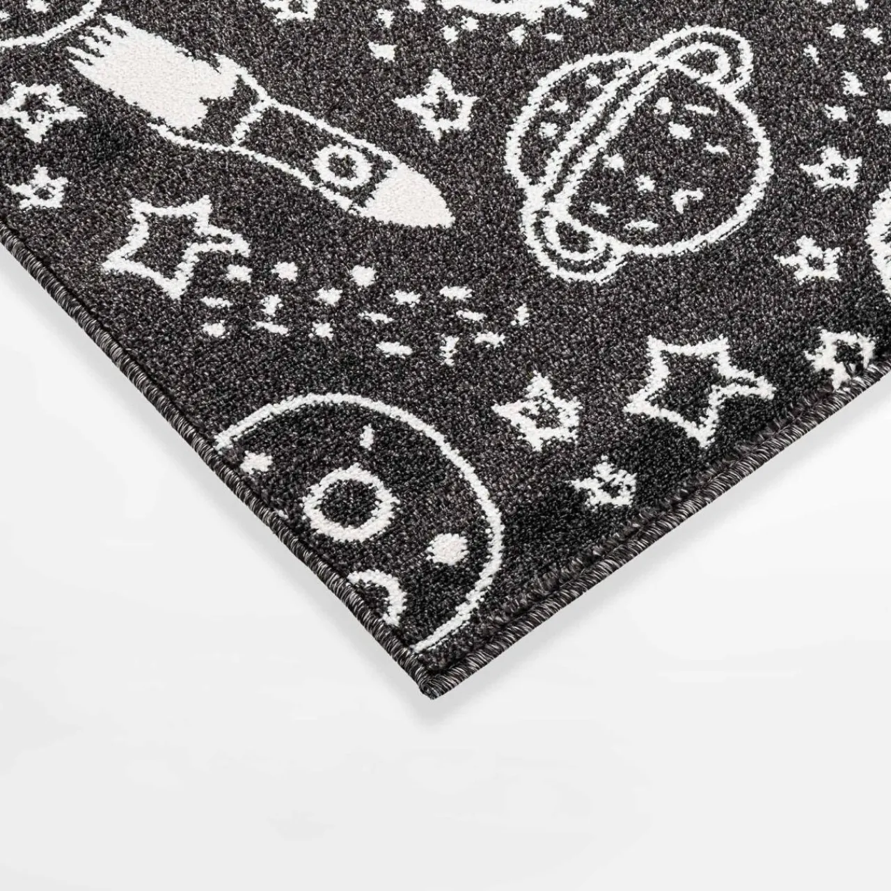 Ale kosmos! Dywan z galaktycznym wzorem w planety i rakiety to idealny pomysł na dekorację pokoju dziecięcego.