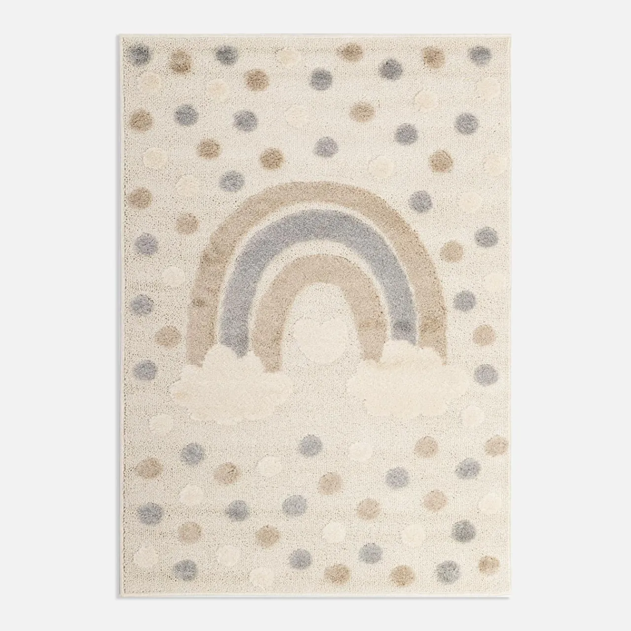 Zastanawiasz się, jak stworzyć przyjazne i bezpieczne miejsce do zabawy? Wybierz beżowy dywan CLUDI z wesołą tęczą i groszkami!