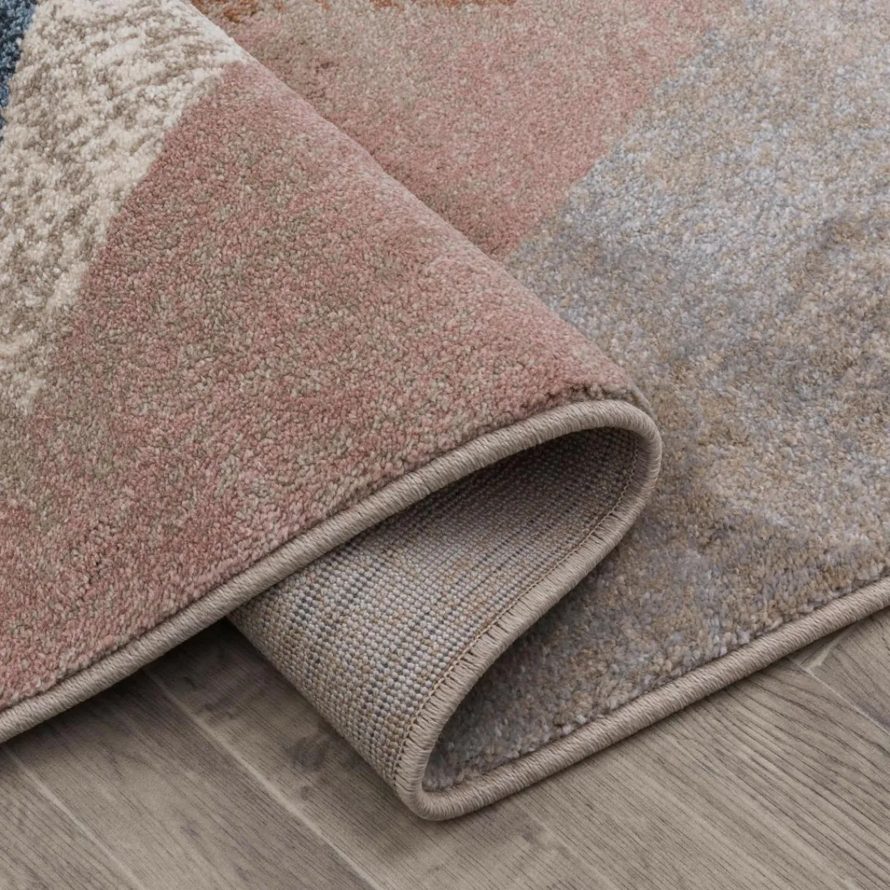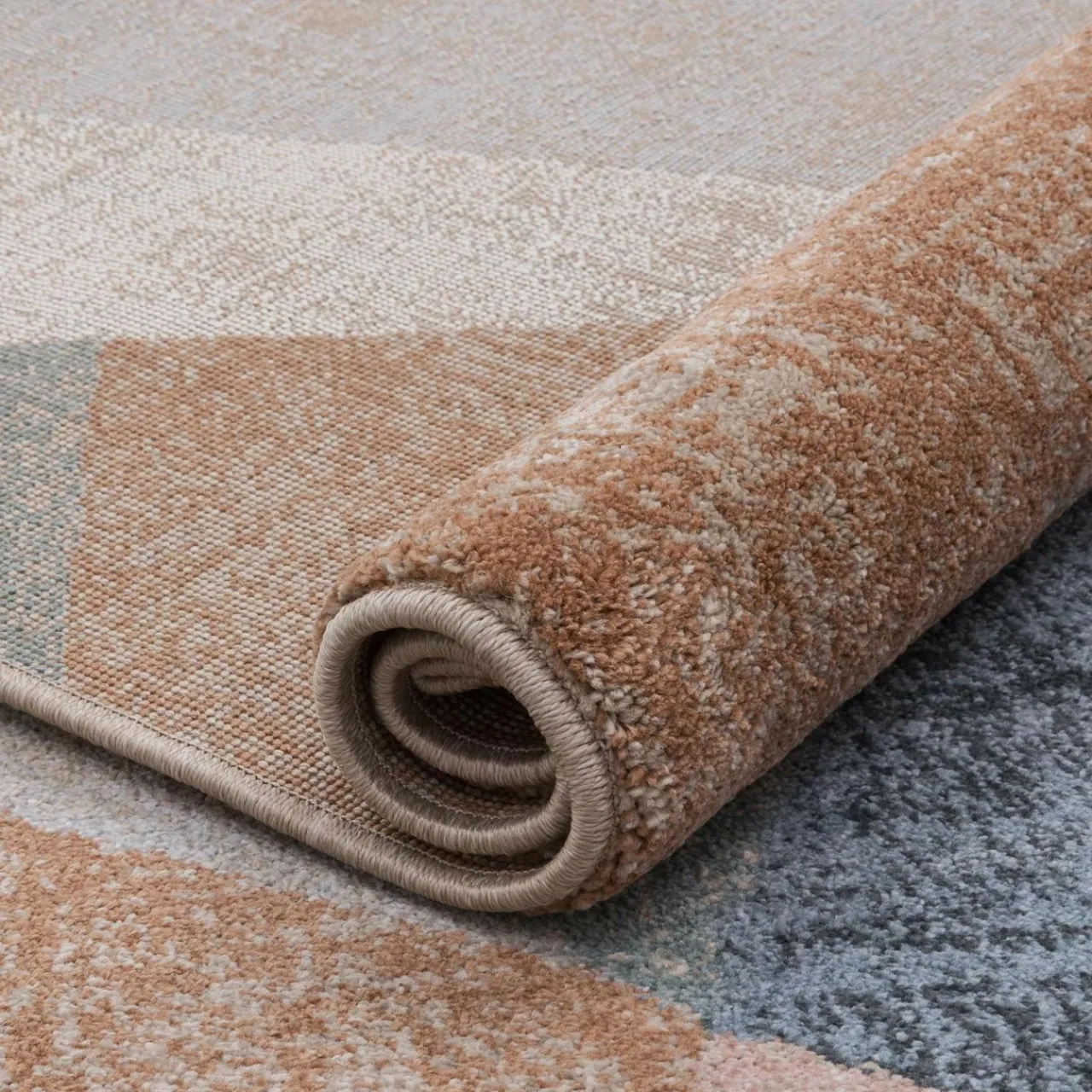 - Dynamiczny wzór geometryczny wykorzystuje odcienie niebieskiego, pomarańczowego, beżu i różu.