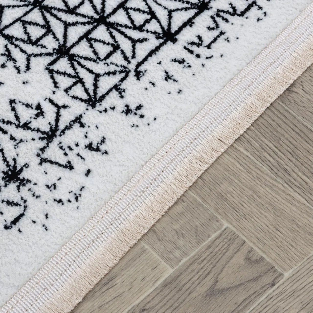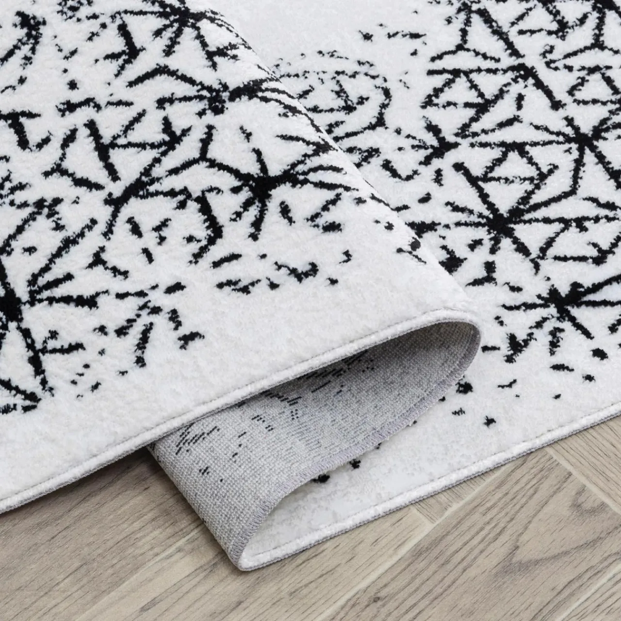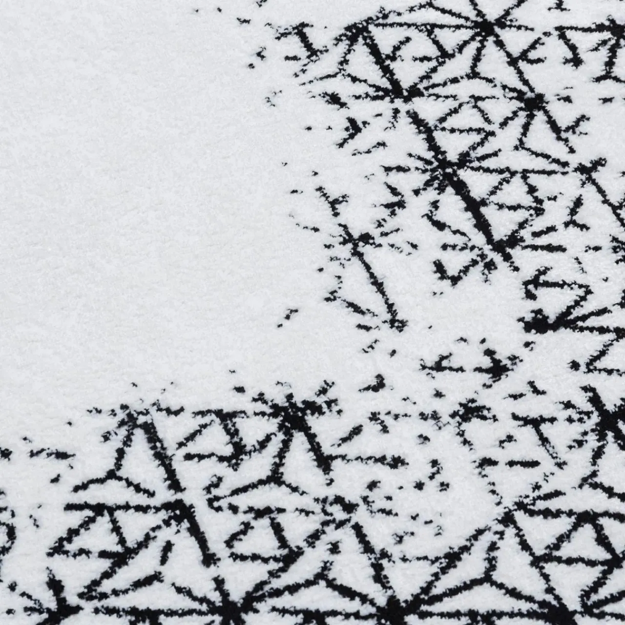 - Biały dywan zdobi nieregularna, geometryczna rama w nowoczesnym stylu.