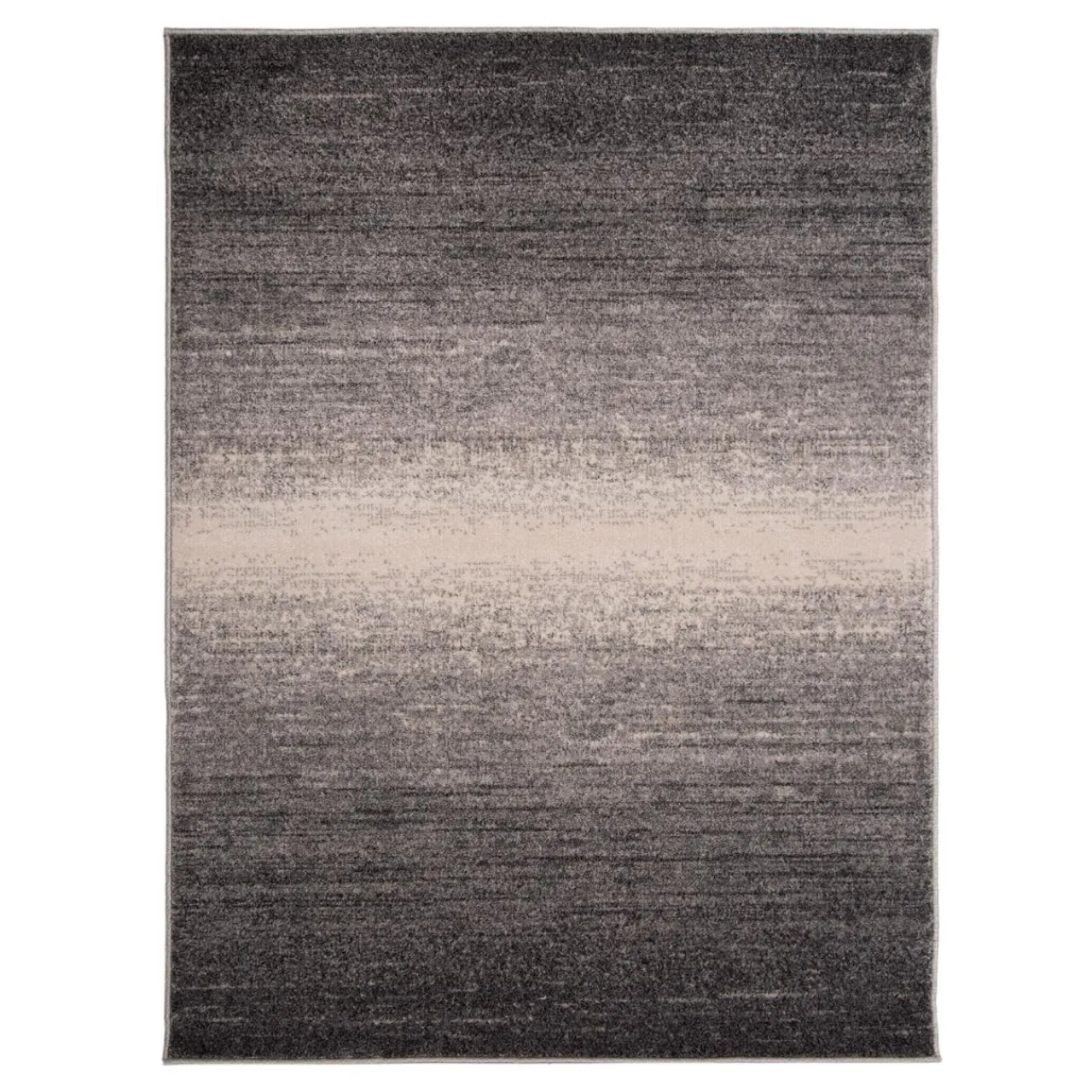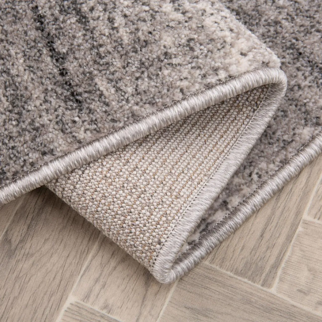 - Wzór dywanu jest abstrakcyjny. Przypomina nieco płótno malarskie, na którym malarz wykonał podmalówkę. Na górze i na dole rozlokowane są ciemniejsze odcienie szarości, na samym środku znajduje się beżowe pasmo. Ze względu na niejednolitą barwę, dywan sprawia wrażenie przecieranego i w związku z tym, pasować będzie również do wnętrz w stylu vintage.