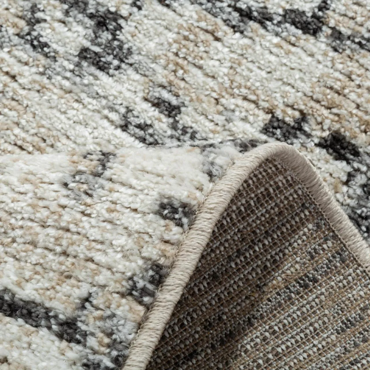 Kremowo-szary dywan HARMONY z abstrakcyjnym wzorem wprowadza stylowy akcent do wnętrz w stylu skandynawskim, nowoczesnym i industrialnym.