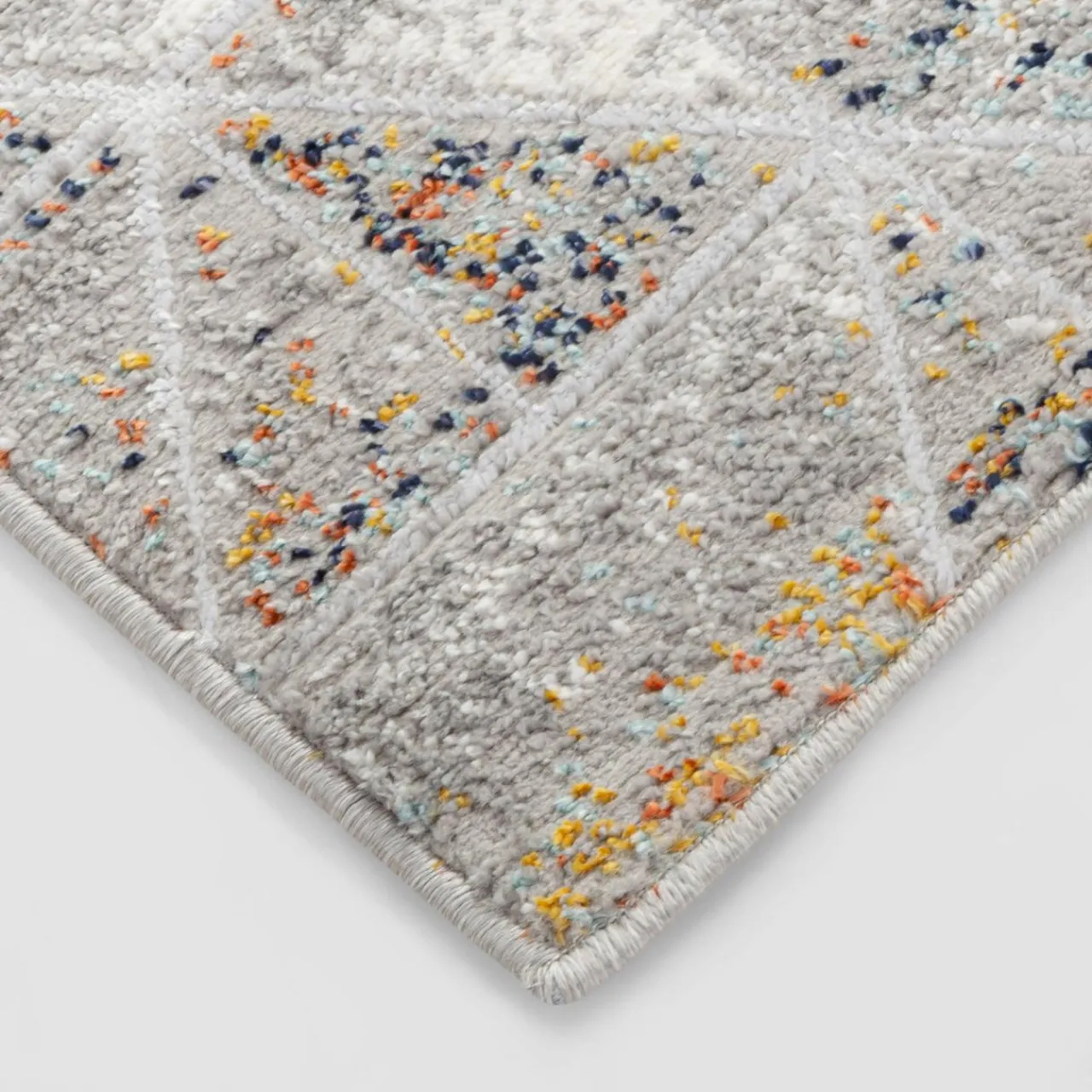 - Dywan zdominowany jest przez szary kolor, który przełamuje żywsza paleta barw: niebieskawa i pomarańczowa.