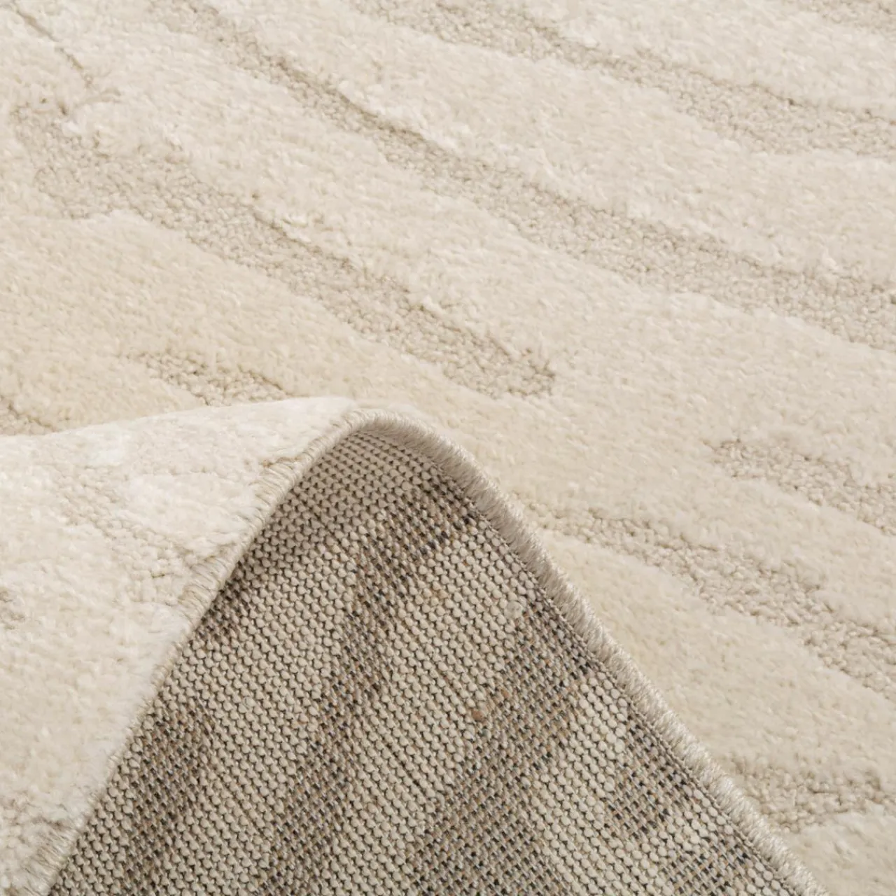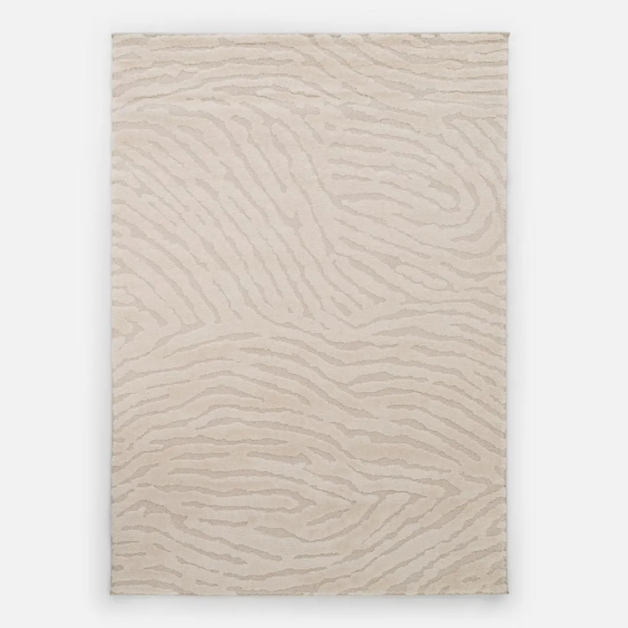 Dywan DEUS wyróżnia subtelny wzór inspirowany naturą – przypomina odcisk palca, fale lub wydmy widziane z lotu ptaka. Taki wzór wprowadza harmonię, uspokaja aranżację, jednocześnie stanowiąc ciekawy akcent we wnętrzu.
