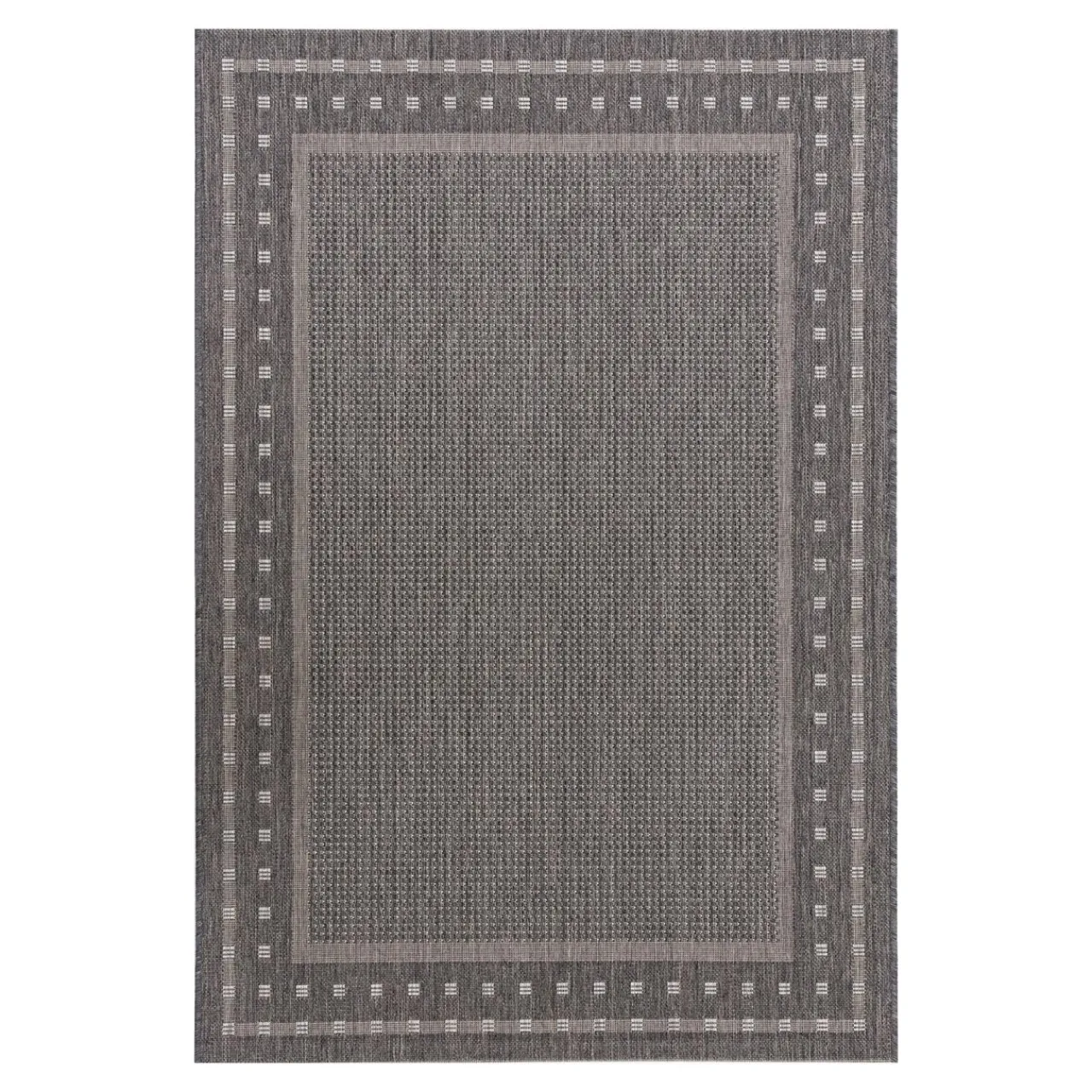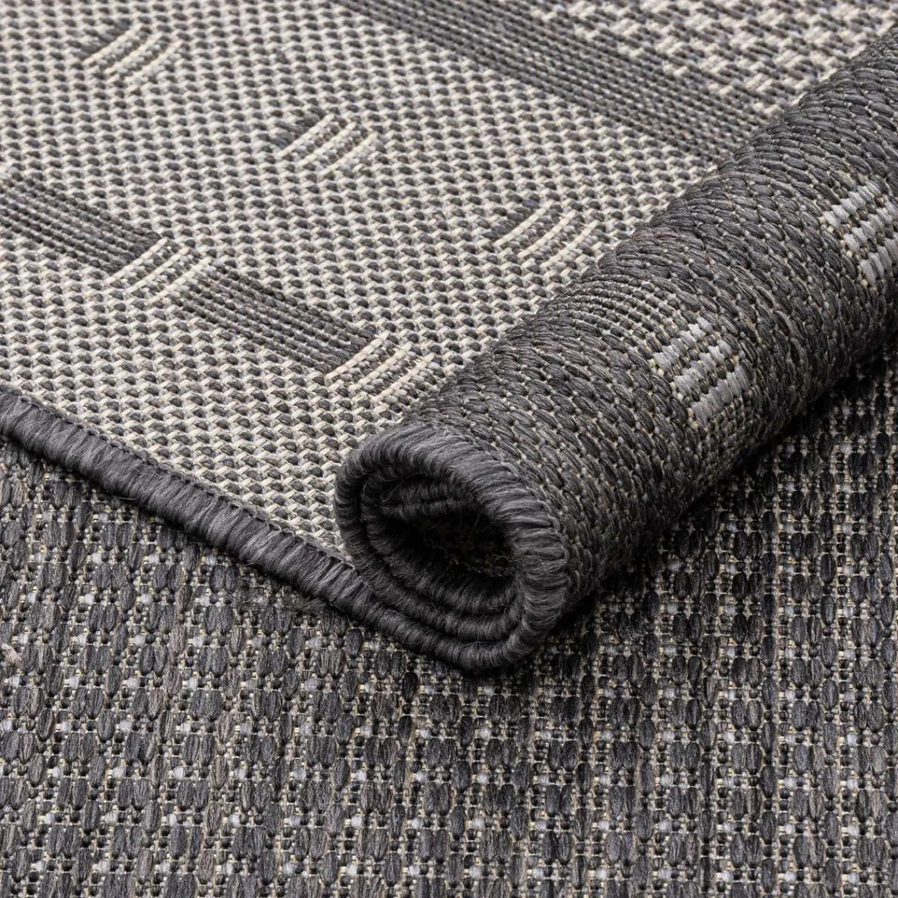 Szary dywan ze wzorem ramy sprawi, że Twój salon pod chmurką przeistoczy się w eleganckie i przytulne miejsce.
