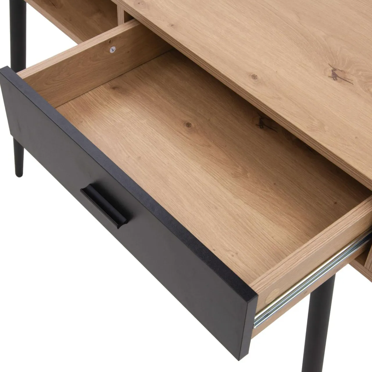Korpus biurka wykończony jest okleiną drewnopodobną. Rysunek sęków i słojów przypomina naturalne drewno dębowe.