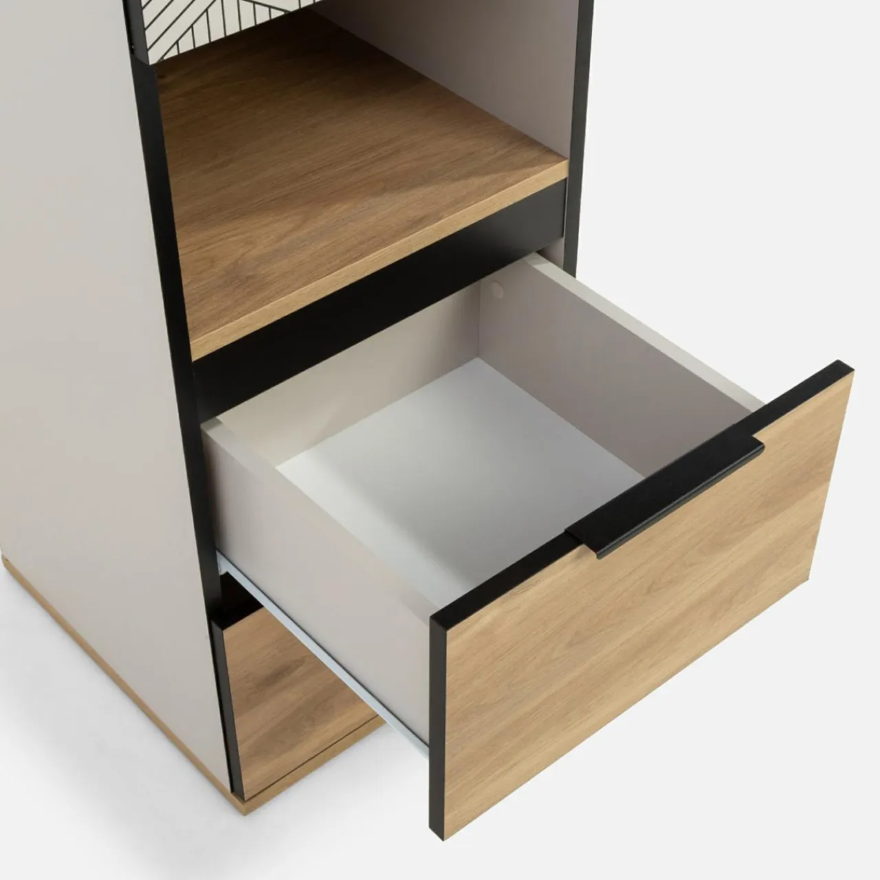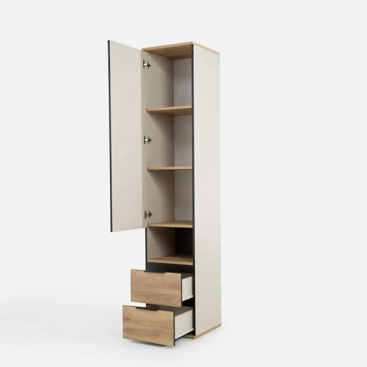 Wąska szafa MAZE będzie świetnym uzupełnieniem do pokoju. Może stanowić zarówno szafę, jak i zamknięty regał.