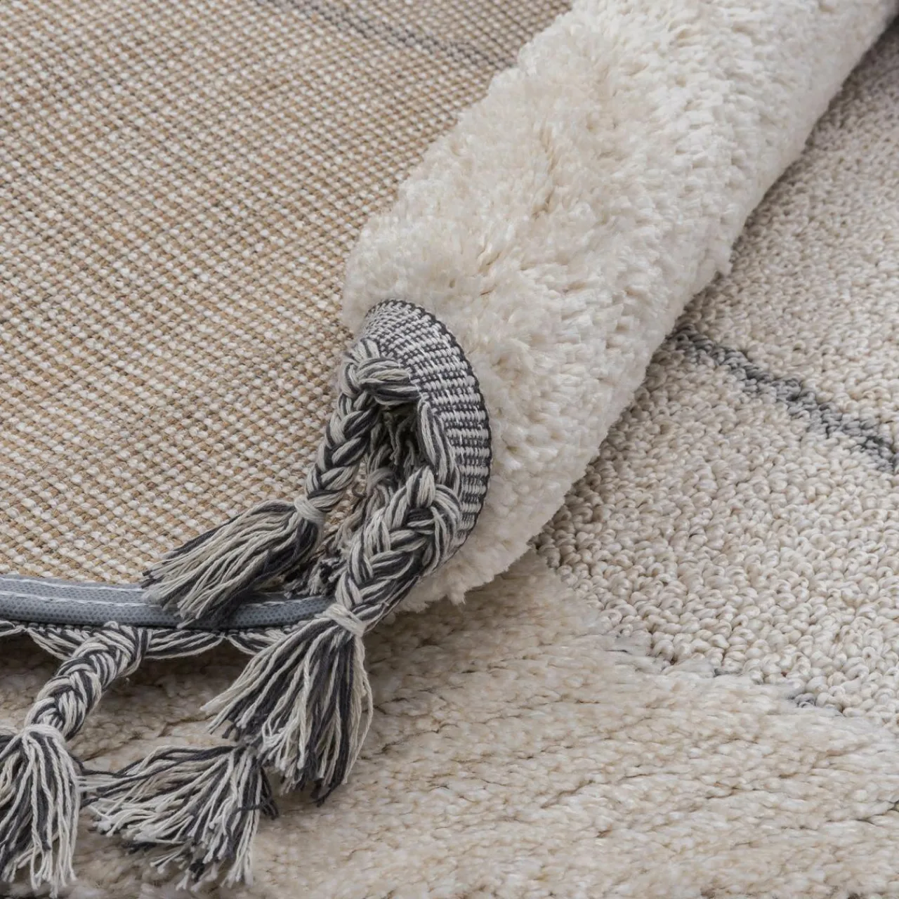 Okrągły dywan w kremowym kolorze i ozdobnymi frędzlami pasuje do jasnych mebli i ścian w naturalnych barwach.