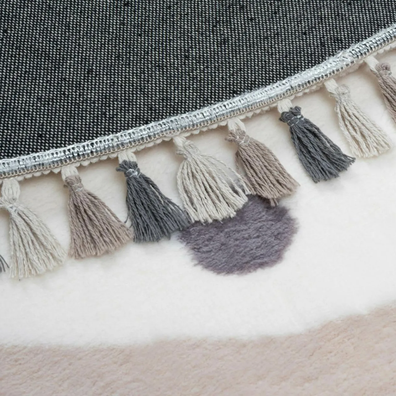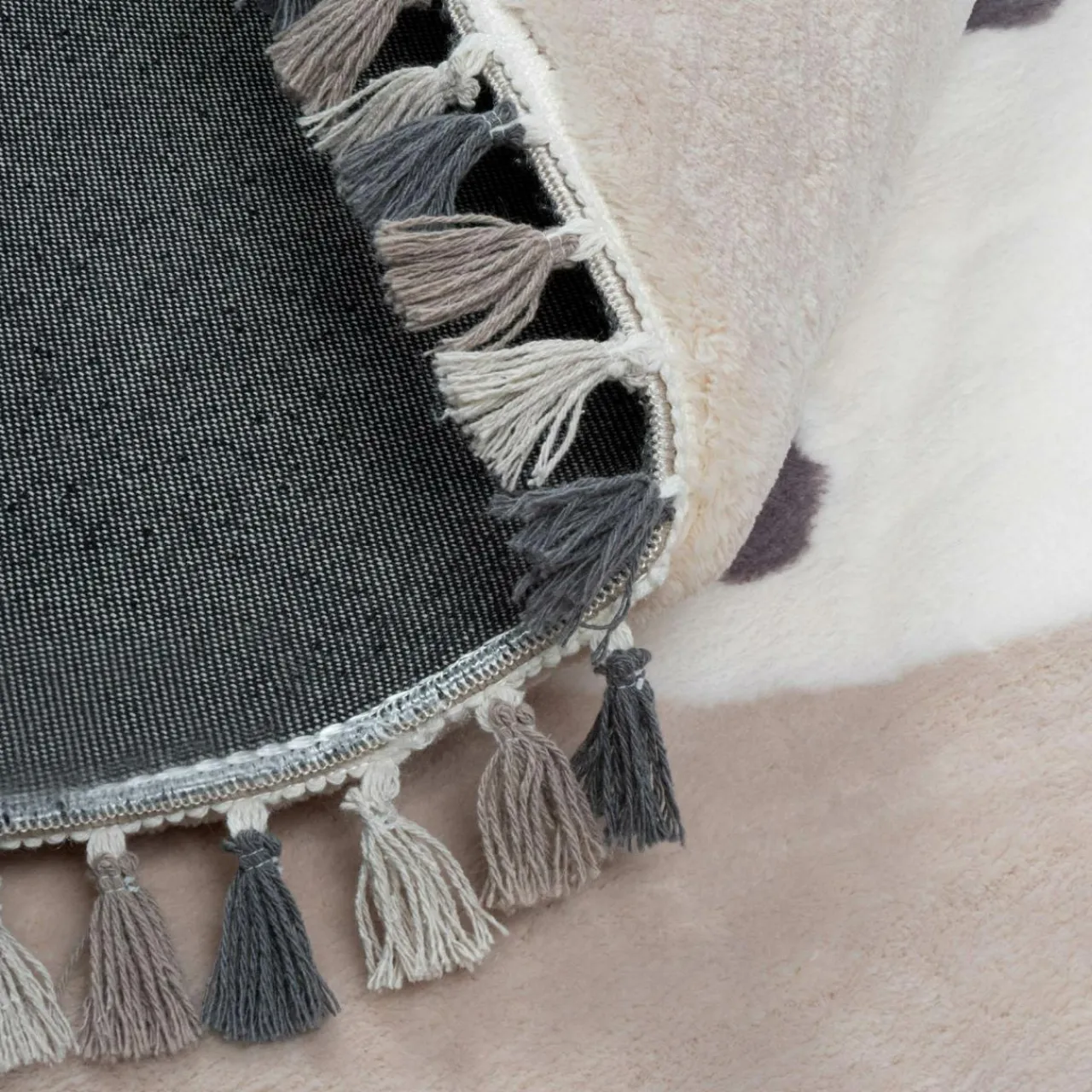 Okrągły dywan w beżowo-kremowym kolorze i z ozdobnymi frędzlami pasuje do jasnych mebli i ścian w naturalnych barwach.