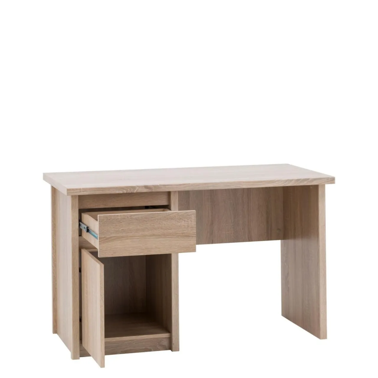 Biurko NORTON cechuje się prostą minimalistyczną formą, która sprawia, że mebel pasuje do nowoczesnych wnętrz. Laminat w jasnym kolorze dębu sonoma, dekorem przypominający drewno, wprowadzi do biura, domowego gabinetu lub pokoju młodzieżowego przytulny klimat. Brak tradycyjnych uchwytów sprawia, że mebel łatwiej wkomponować w dowolną aranżację.
