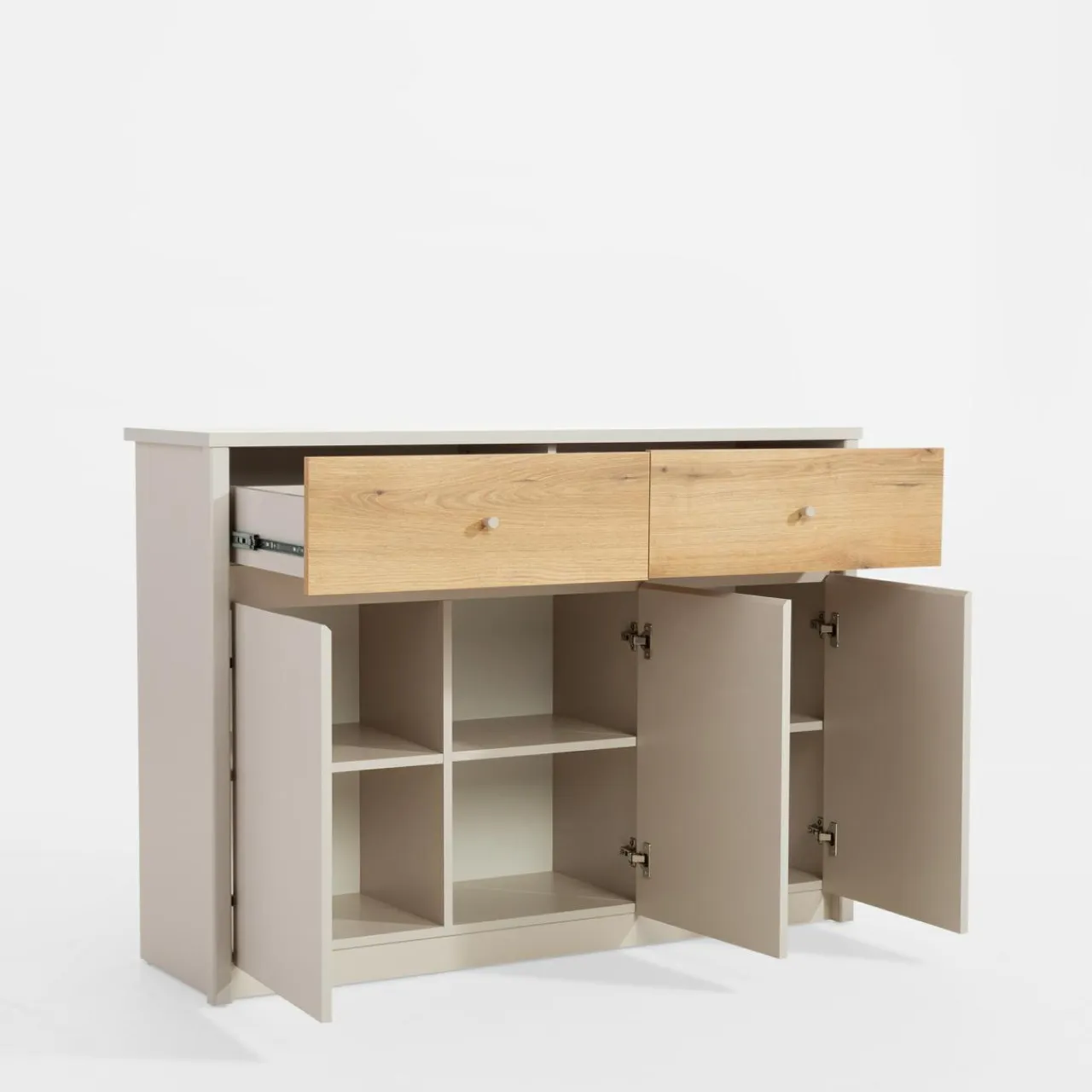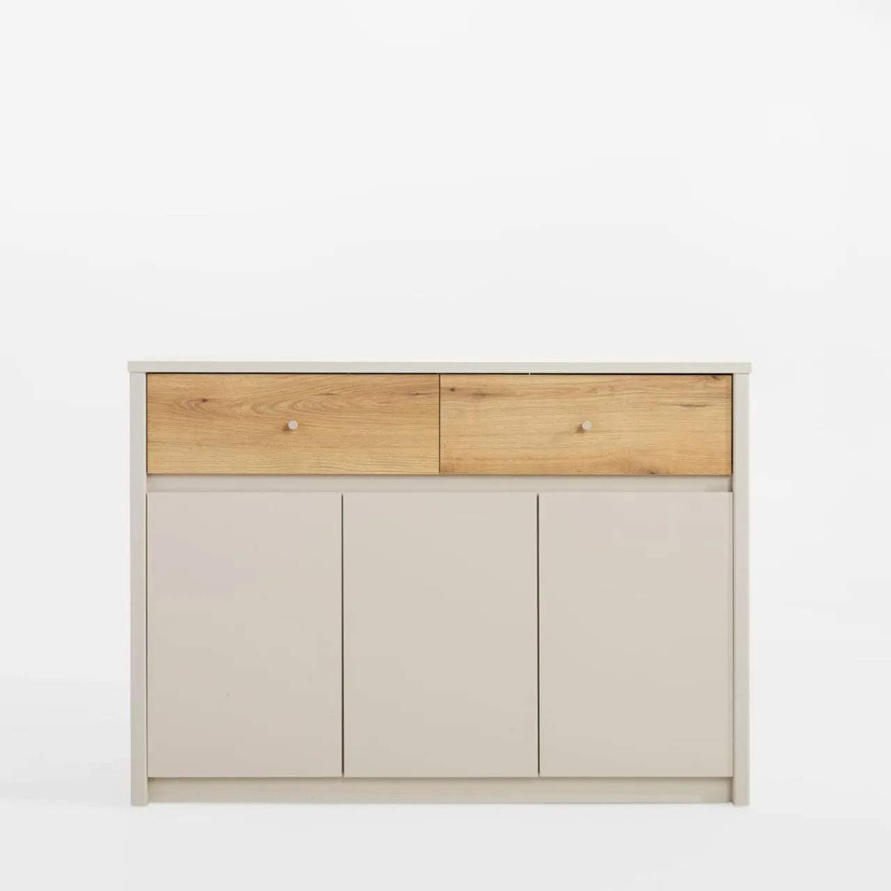 Komoda KARIN sprawdzi się zarówno w jadalni, ale również pokoju dziennym i sypialni. W 3 szafkach przechowasz różne, większe przedmioty — naczynia, tekstylia domowe czy pościel.
