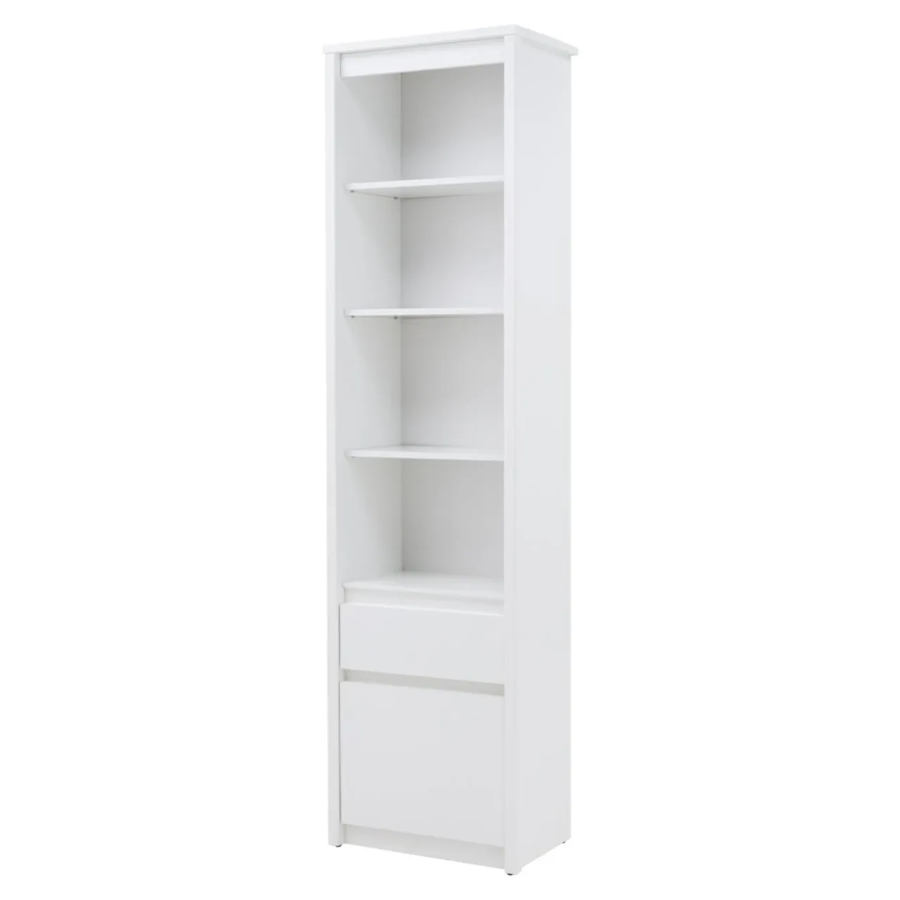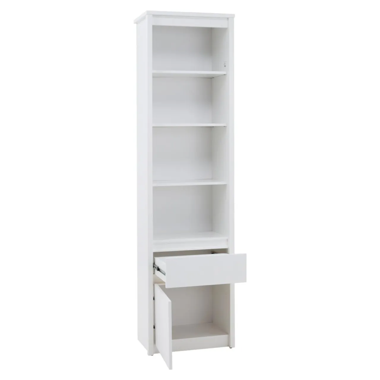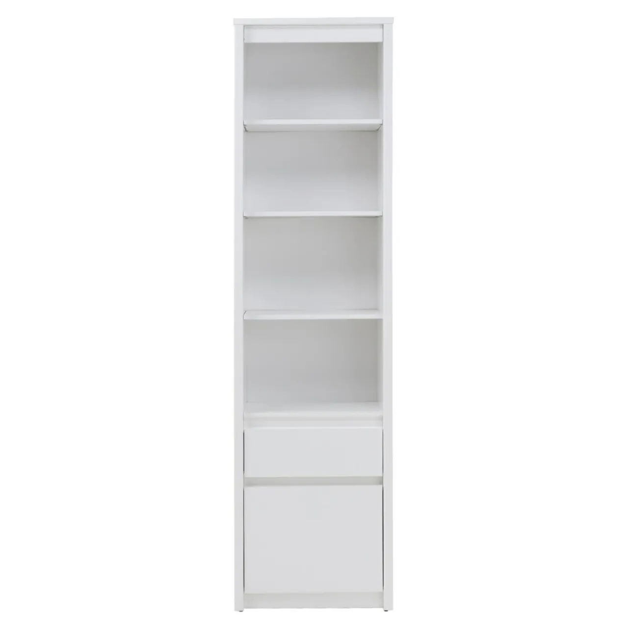 Uniwersalna kolorystyka regału ERDEN sprawia, że pomieszczenie wydaje się większe i jaśniejsze, a ponadto dobrze łączy się z kompozycjami aranżacyjnymi utrzymanymi w nowoczesnym stylu.