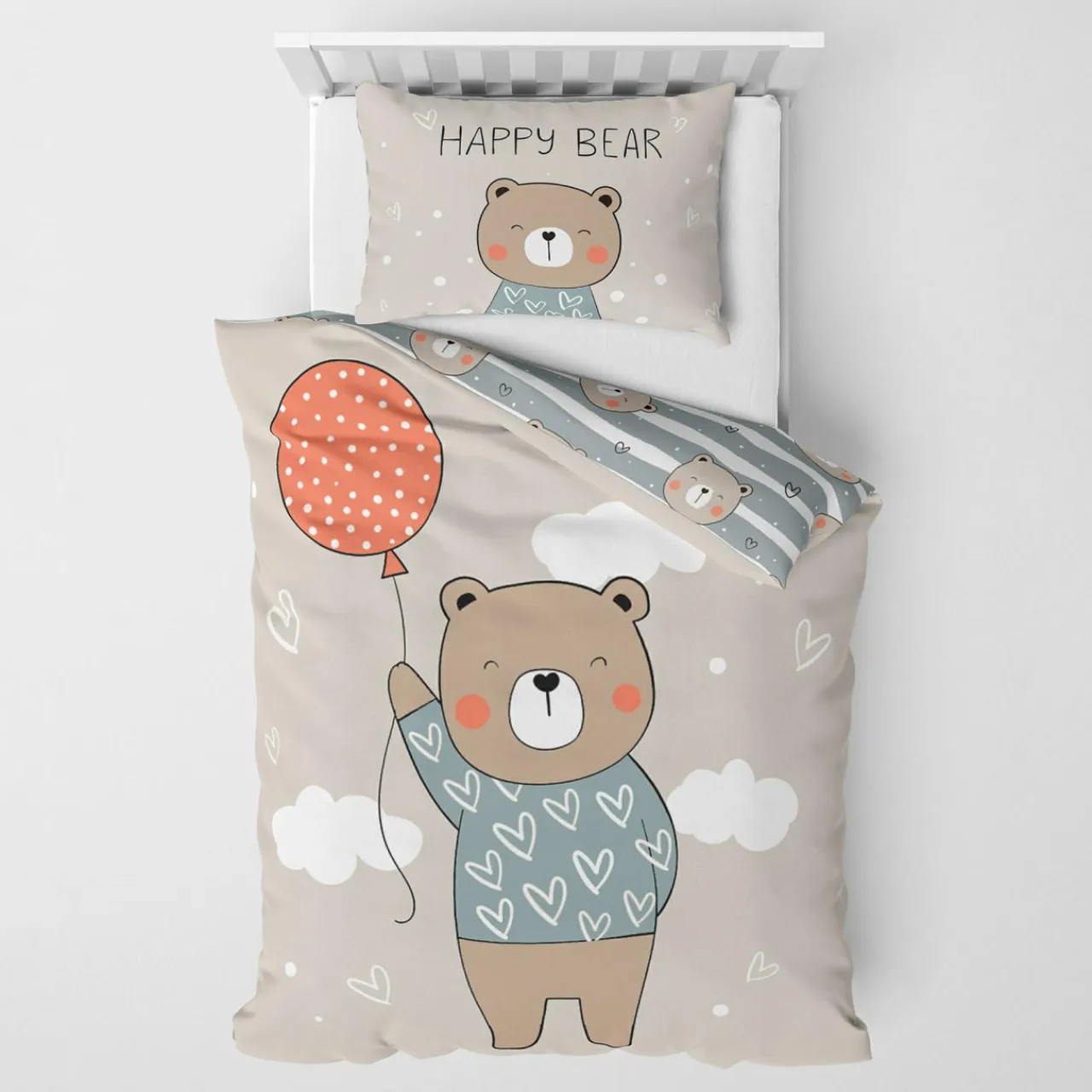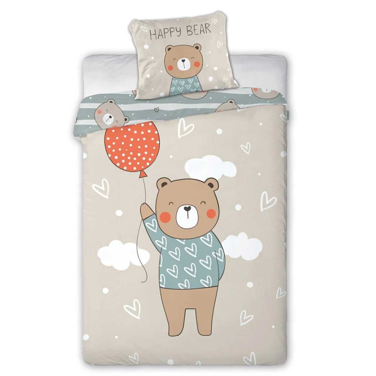 - Pościel wykonana jest z miękkiej w dotyku bawełny, bezpiecznej dla skóry dziecka. Materiał przyjemnie otuli Twojego malucha przed snem. O kolorowe sny zadba wesoły miś (happy bear) w uroczym sweterku w serduszka.