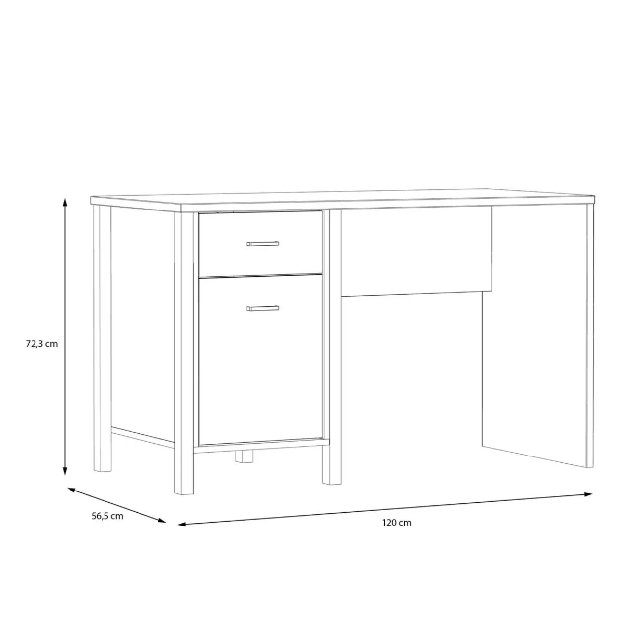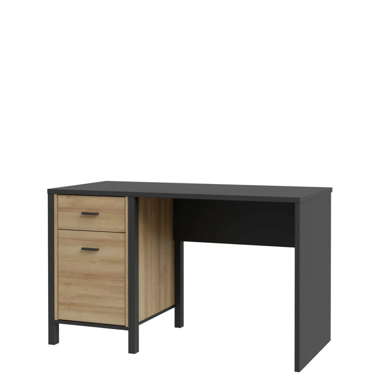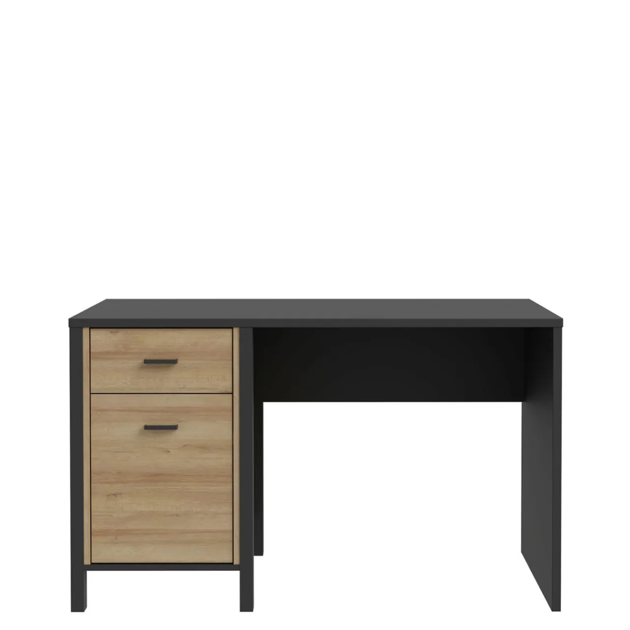- Szuflada i szafka biurka zostały wyposażone w czarne, metalowe uchwyty.