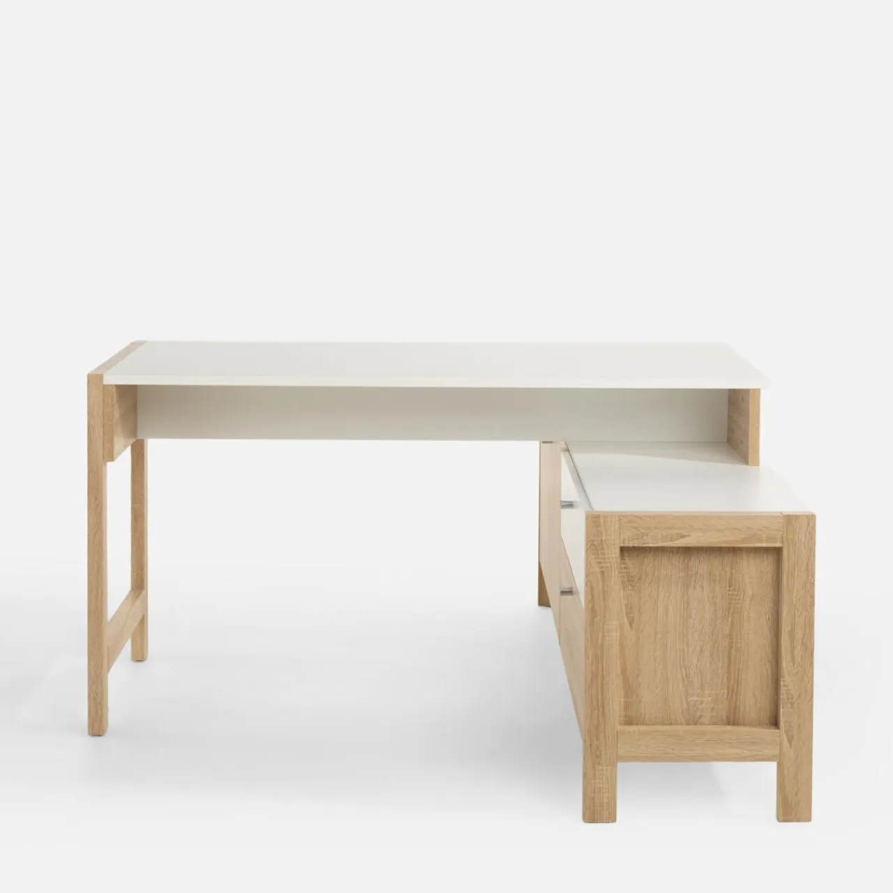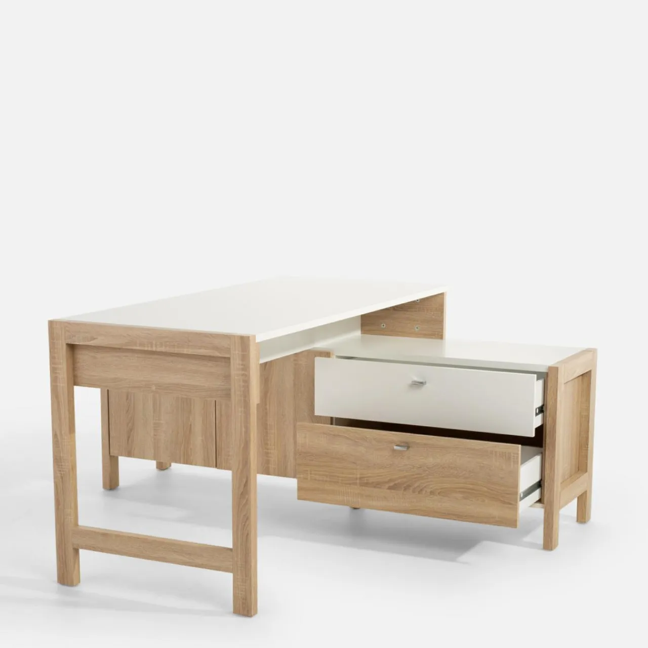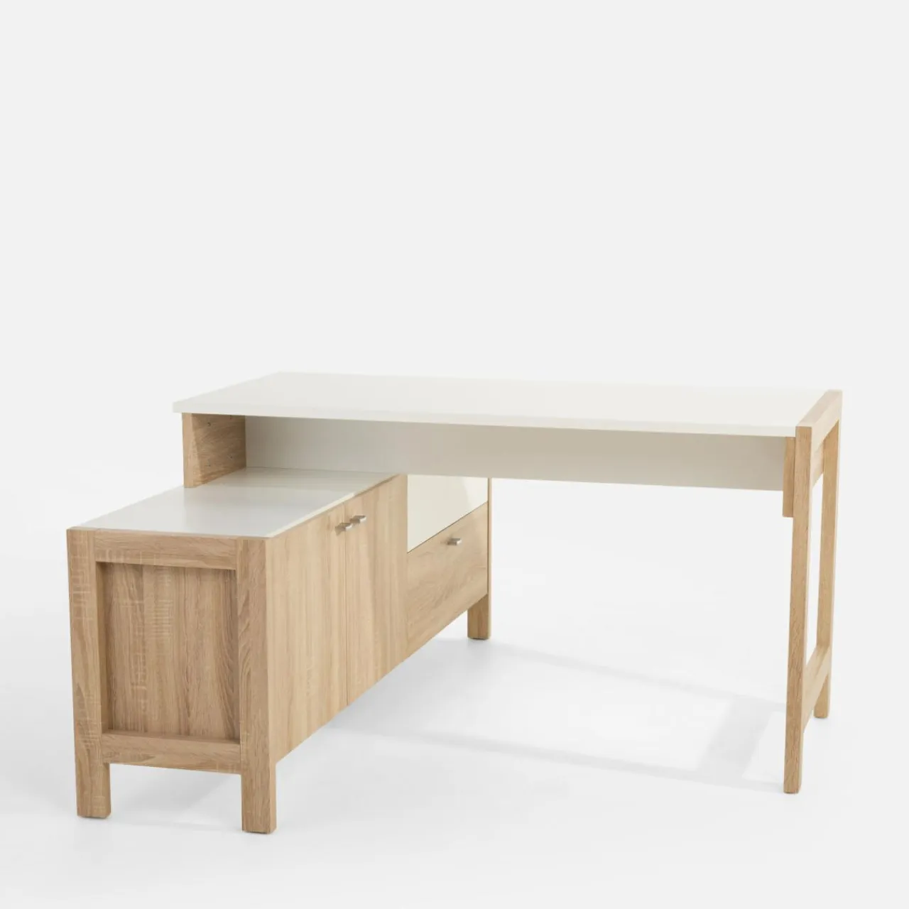 Połączenie biurka z szafką i szufladami zapewni Ci stały i szybki dostęp do najbardziej potrzebnych przedmiotów.