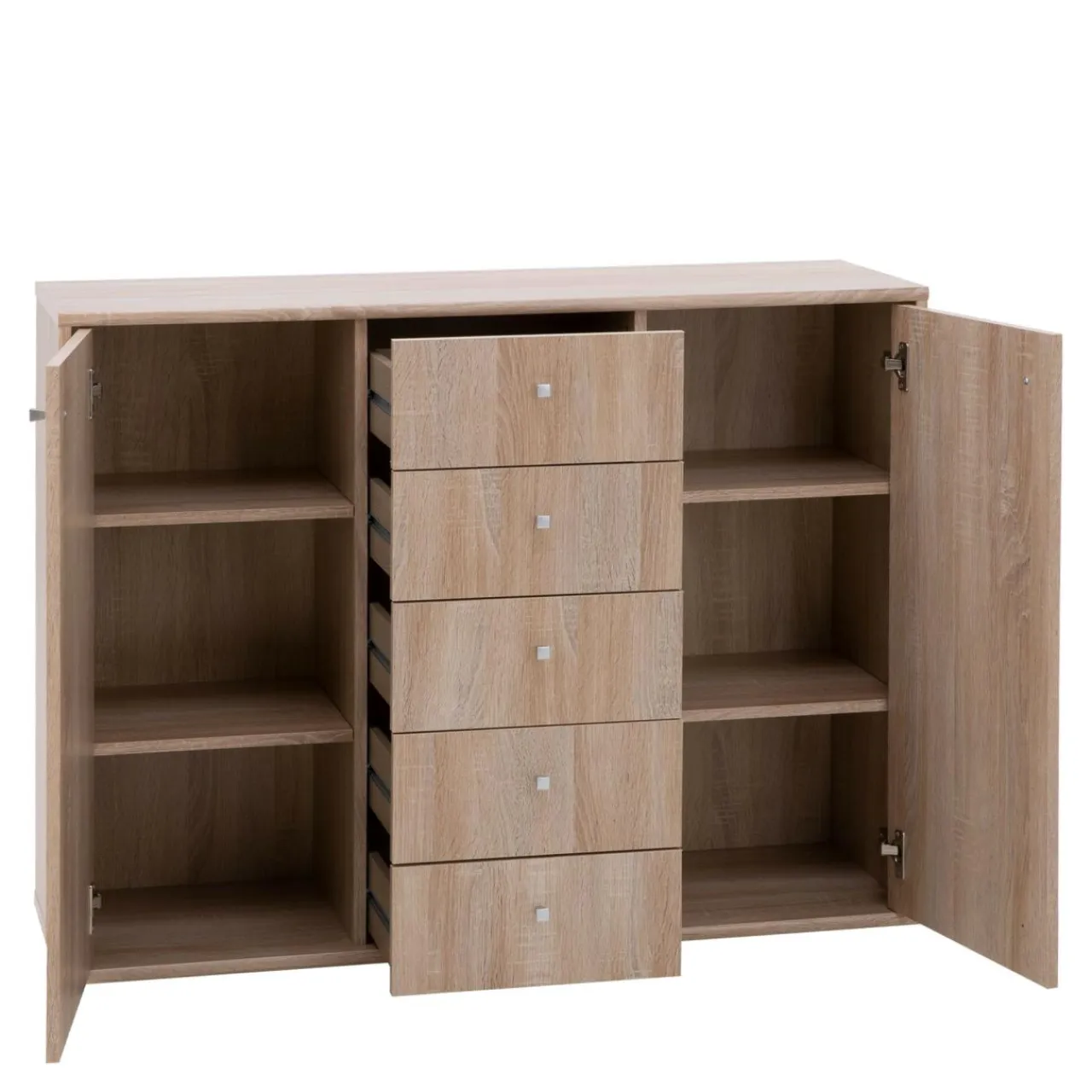 Doskonałym przykładem wykorzystania tej przestrzeni jest model komody wyposażony w 2 drzwi oraz 5 szuflad, w całości wykonany z płyty meblowej i wykończony folią.