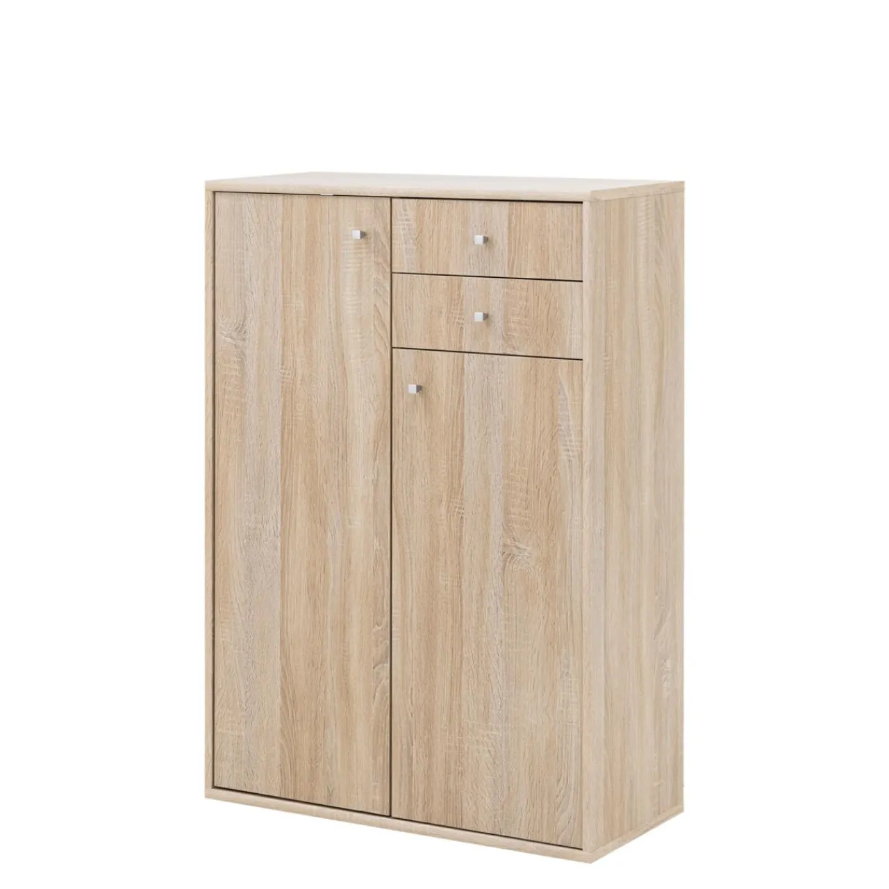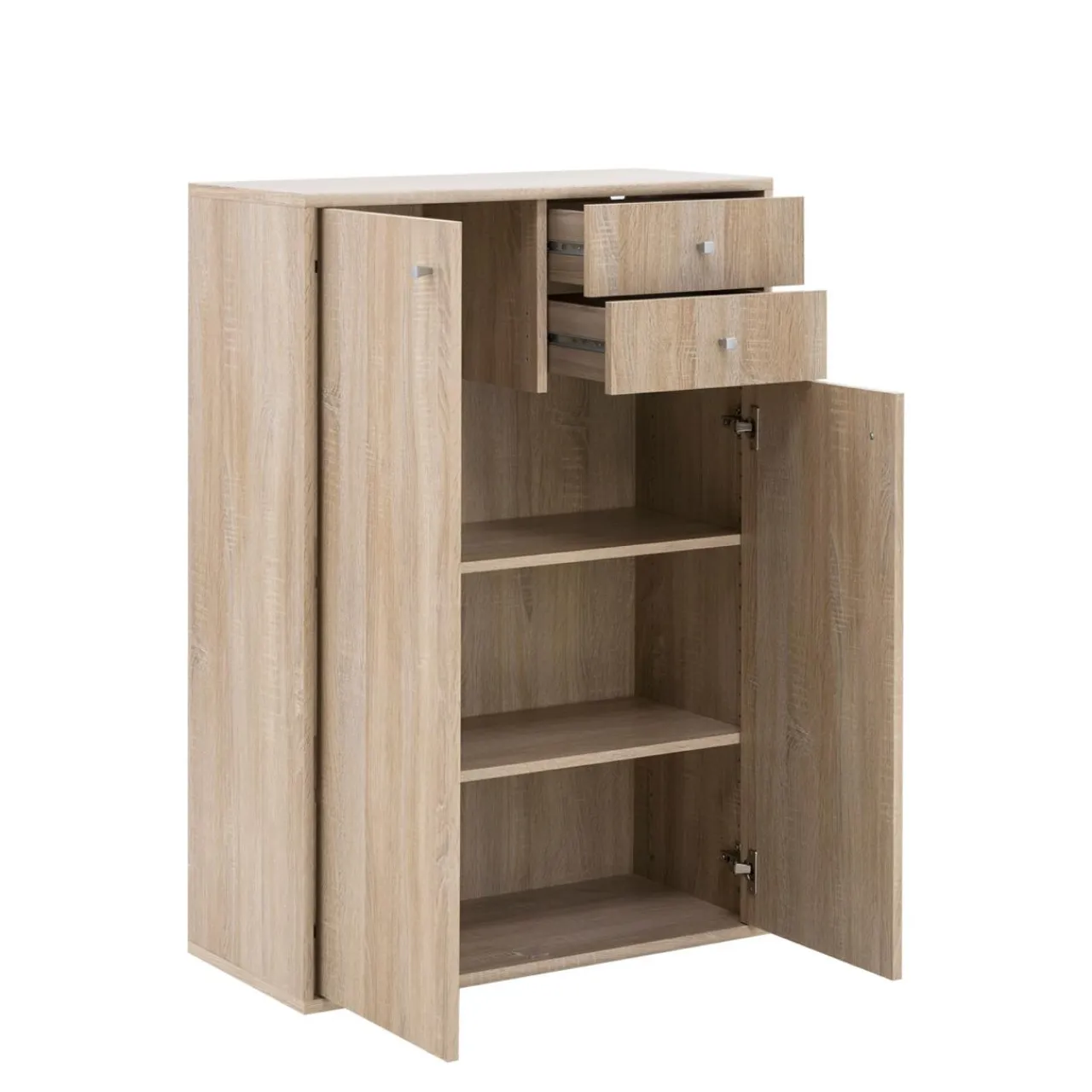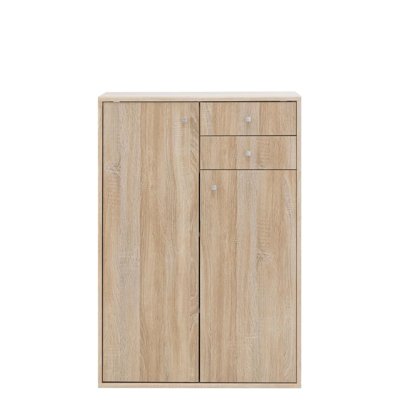 Doskonałym przykładem wykorzystania tej przestrzeni jest model komody wyposażony w 2 drzwi oraz 2 szuflady, w całości wykonany z płyty meblowej i wykończony folią.