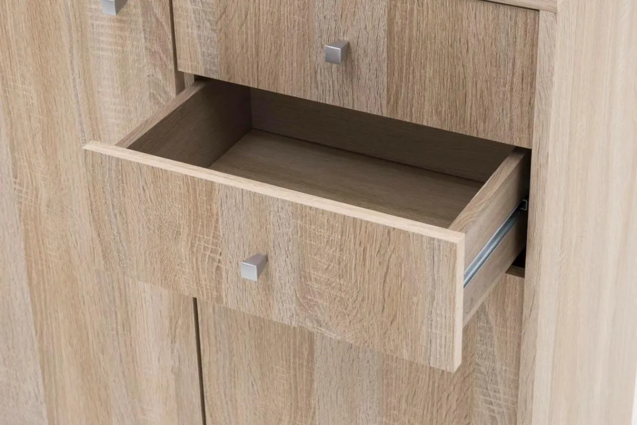 Komoda TEMPRA 2 posiada zamykane szafki z półkami oraz szuflady. Została wykonana z płyty meblowej, pokrytej folią.