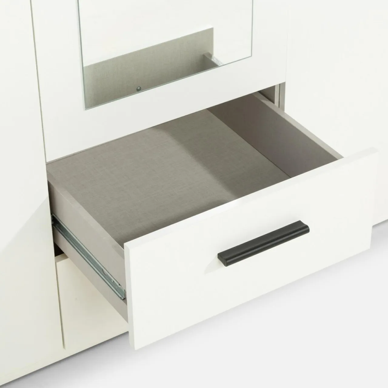 Z szafą TRAWEN oddzielisz odzież wierzchnią od pozostałej części garderoby. Nad drążkami znajdują się półki, na których poukładasz resztę ubrań i dodatki, a w szufladach pomieścisz bieliznę.
