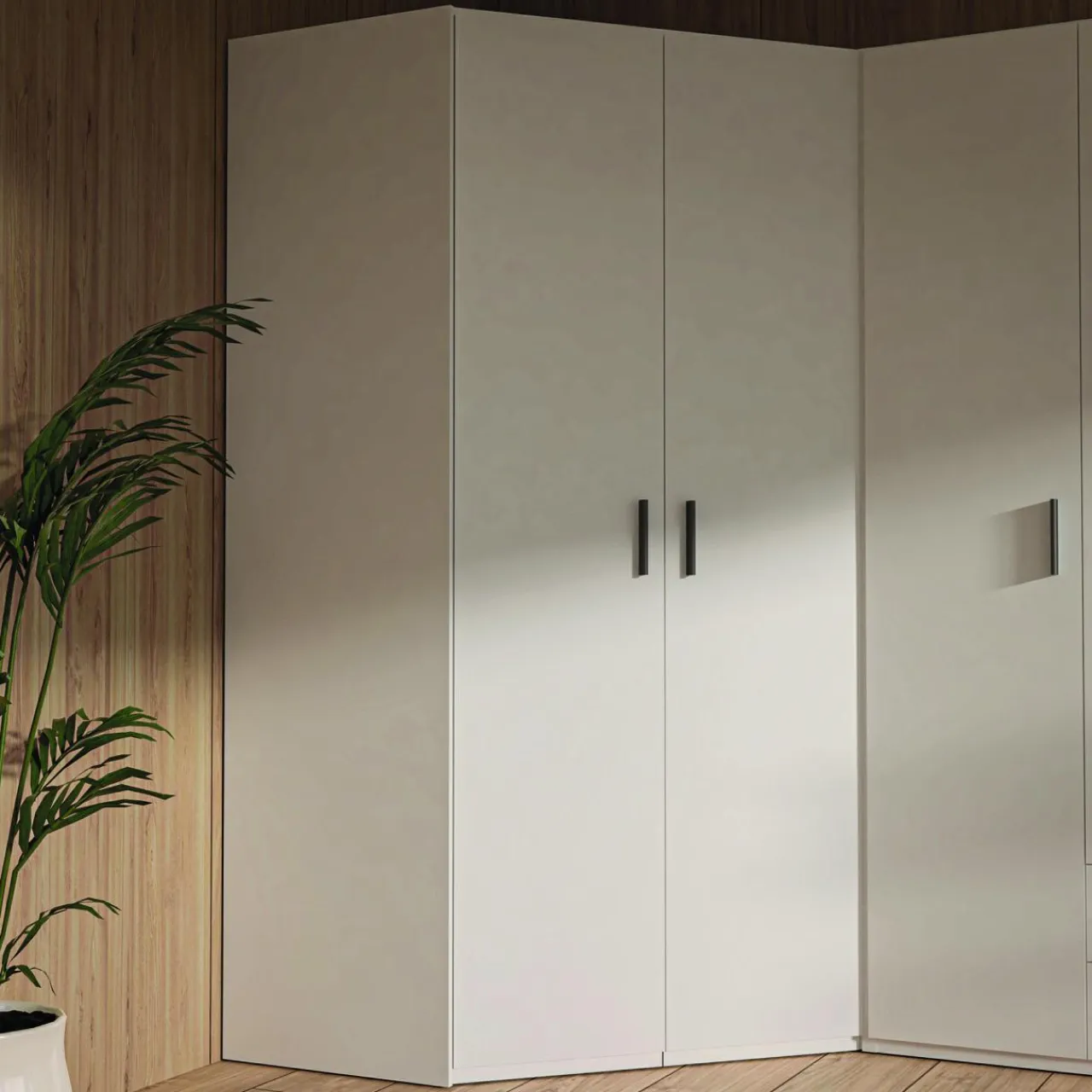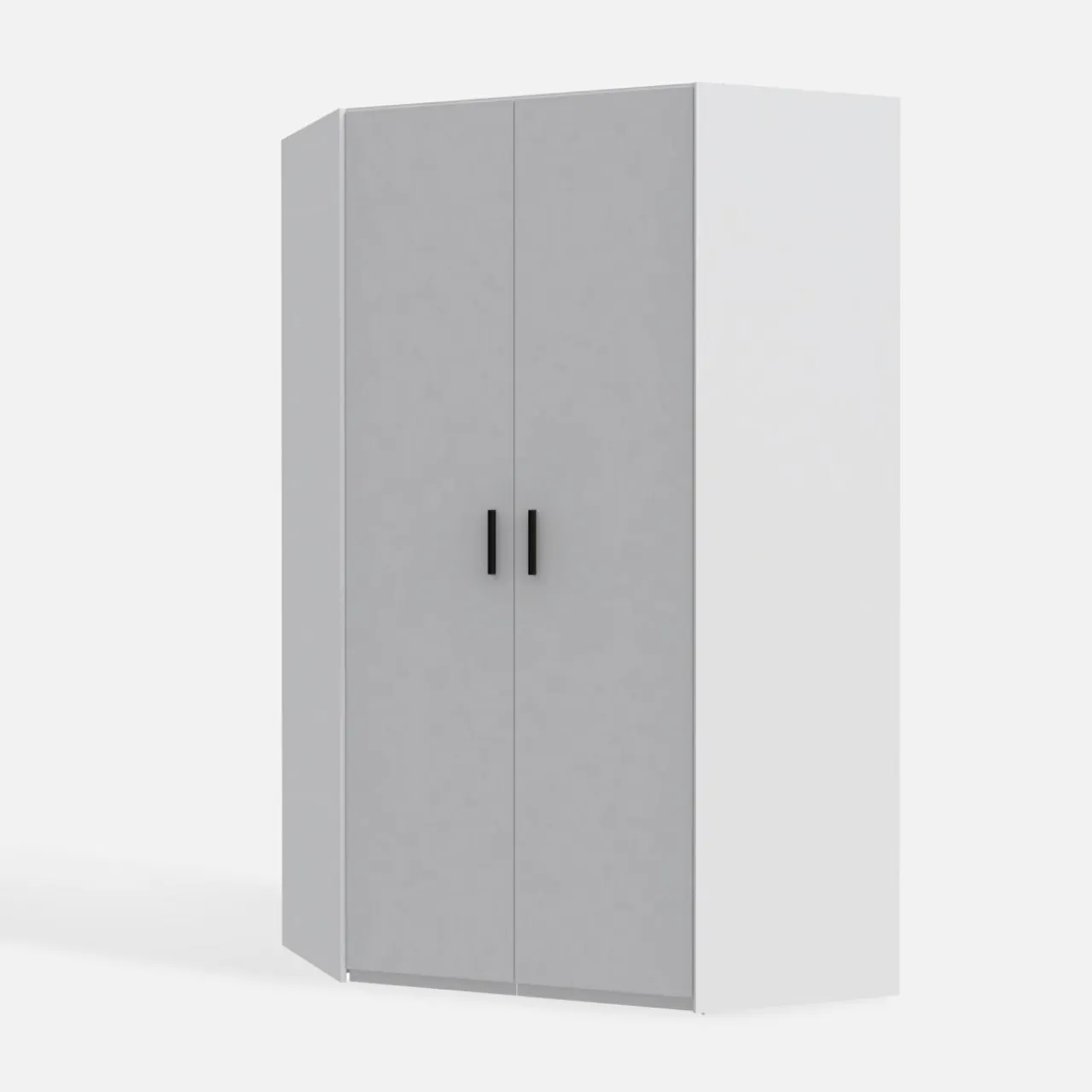 Szafa narożna TRAWEN zabuduje róg pomieszczenia, maksymalnie wykorzystując przestrzeń. W środku znajdują się półki i drążek na ubrania, dzięki którym każda część garderoby będzie miała swoje miejsce.