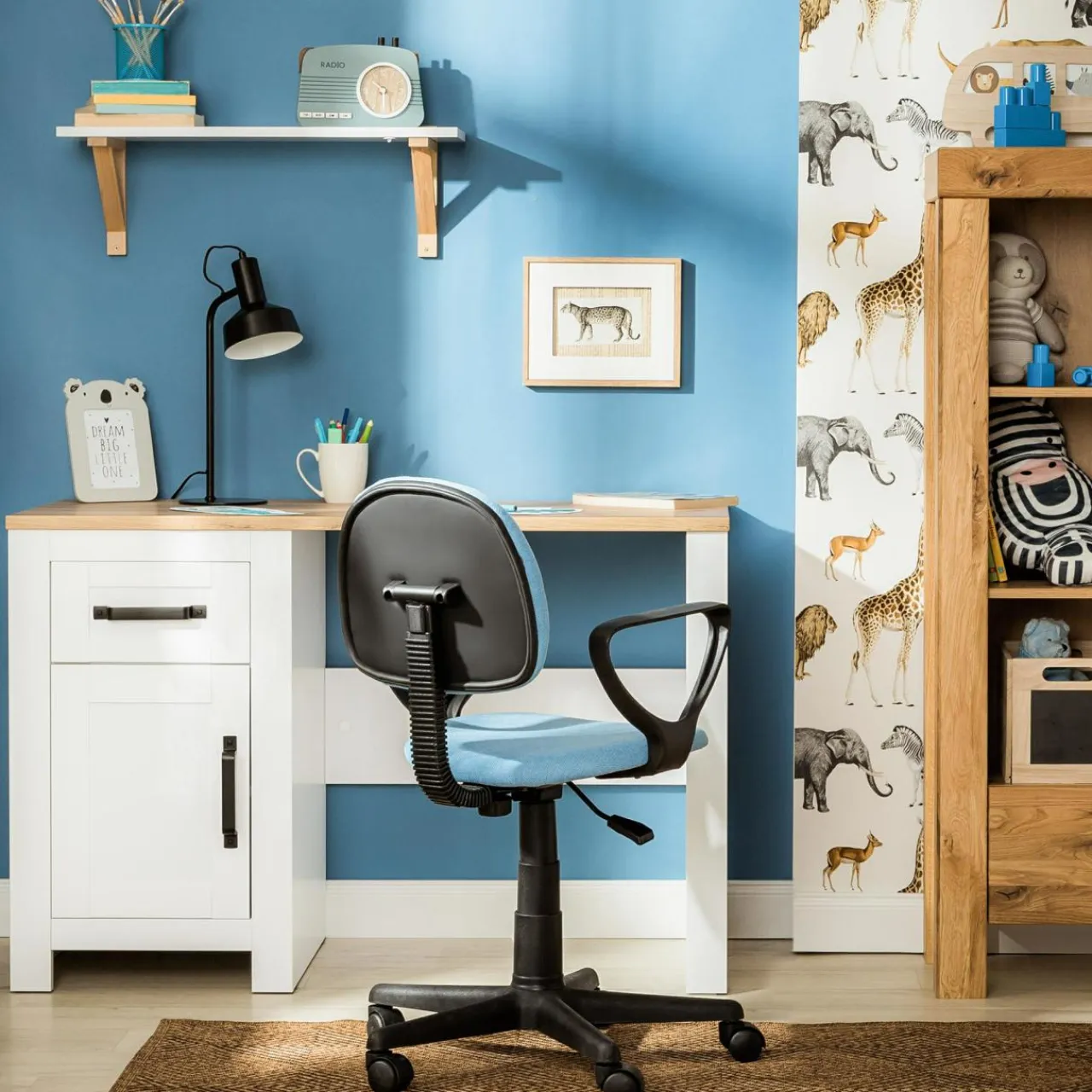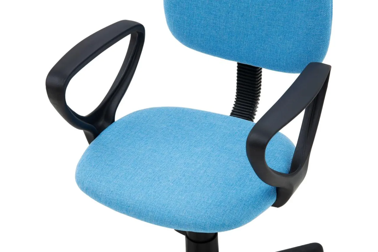 Wybierz fotel obrotowy NUPIG z jasnoniebieską tapicerką i czarną podstawą.