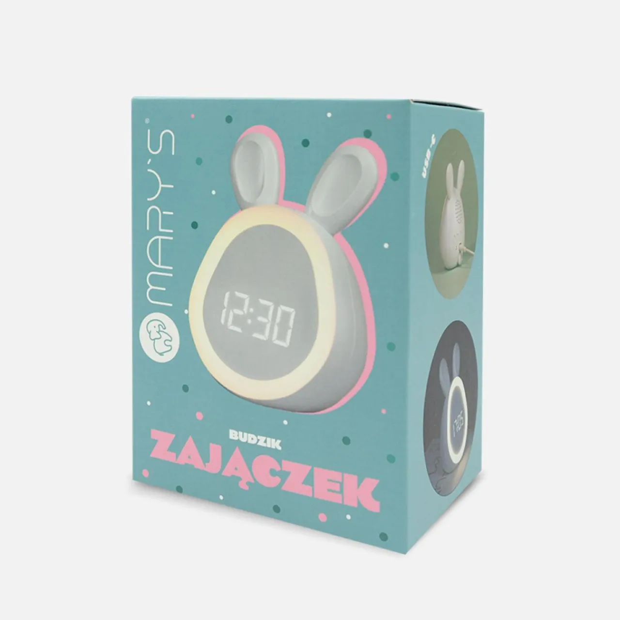 Obudowa budzika MARY’S ZAJĄCZEK jest w białym kolorze z podświetleniem LED. Postaw na komodzie, biurku lub opodal łóżka. Pamiętaj, aby mieć go w zasięgu ręki, zwłaszcza o poranku.