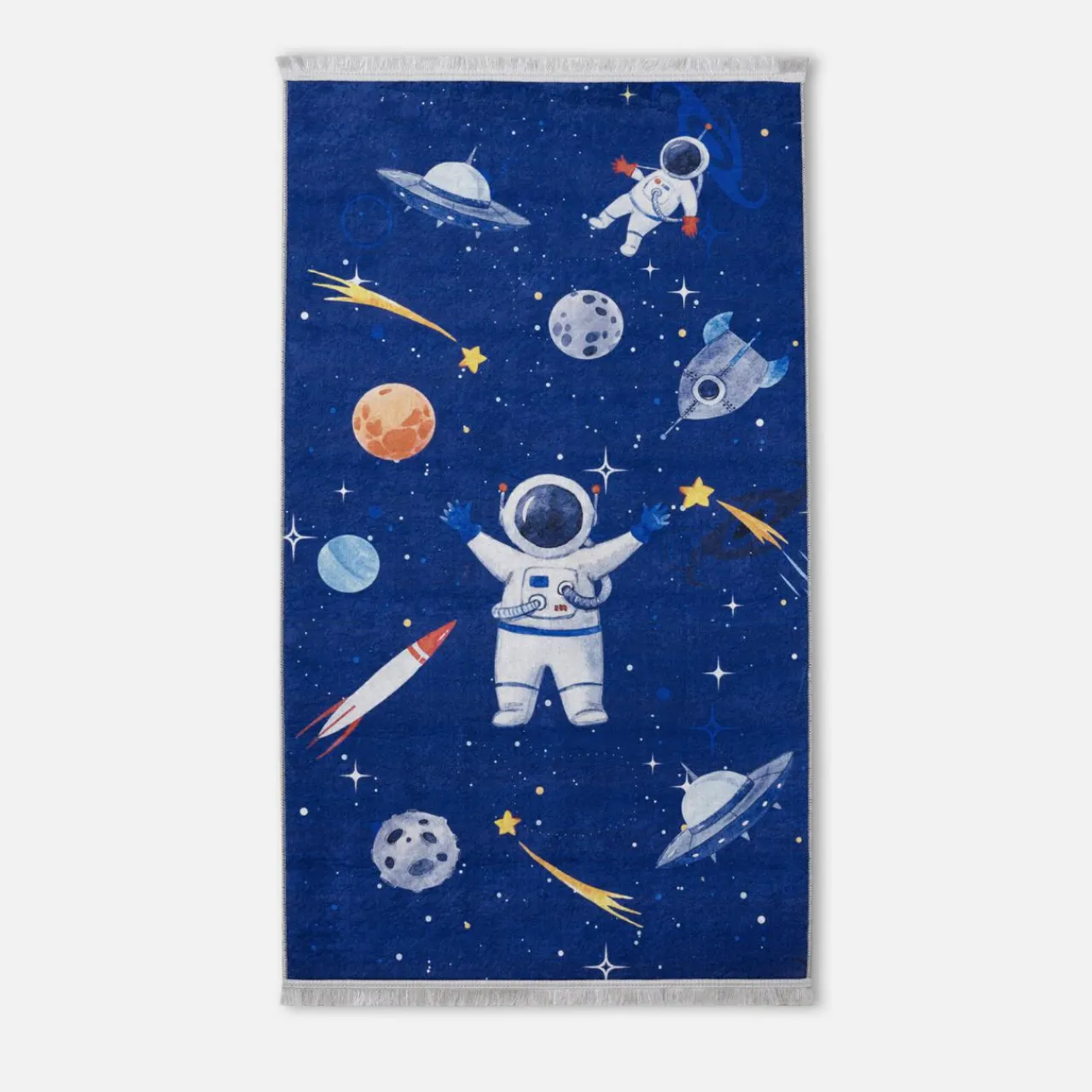 Chcesz stworzyć swojemu dziecku przyjemne miejsce do zabawy? Ozdób pokój malucha wyjątkowym pokryciem podłogowym: dywanem SPAC PETRA z wizerunkiem kosmonautów w przestrzeni kosmicznej. Pobudzi fantazję Twojego dziecka i zachęci je do eksplorowania świata.
