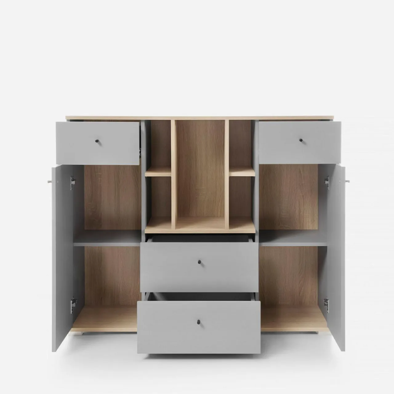 Komoda ORO posiada 4 szuflady i 2 zamykane szafki, które pomogą uporządkować różne przedmioty. Każdy z nich znajdzie swoje miejsce, a podczas szukania odpowiedniej książki lub tego konkretnego podkreślacza, wiesz gdzie zajrzeć.